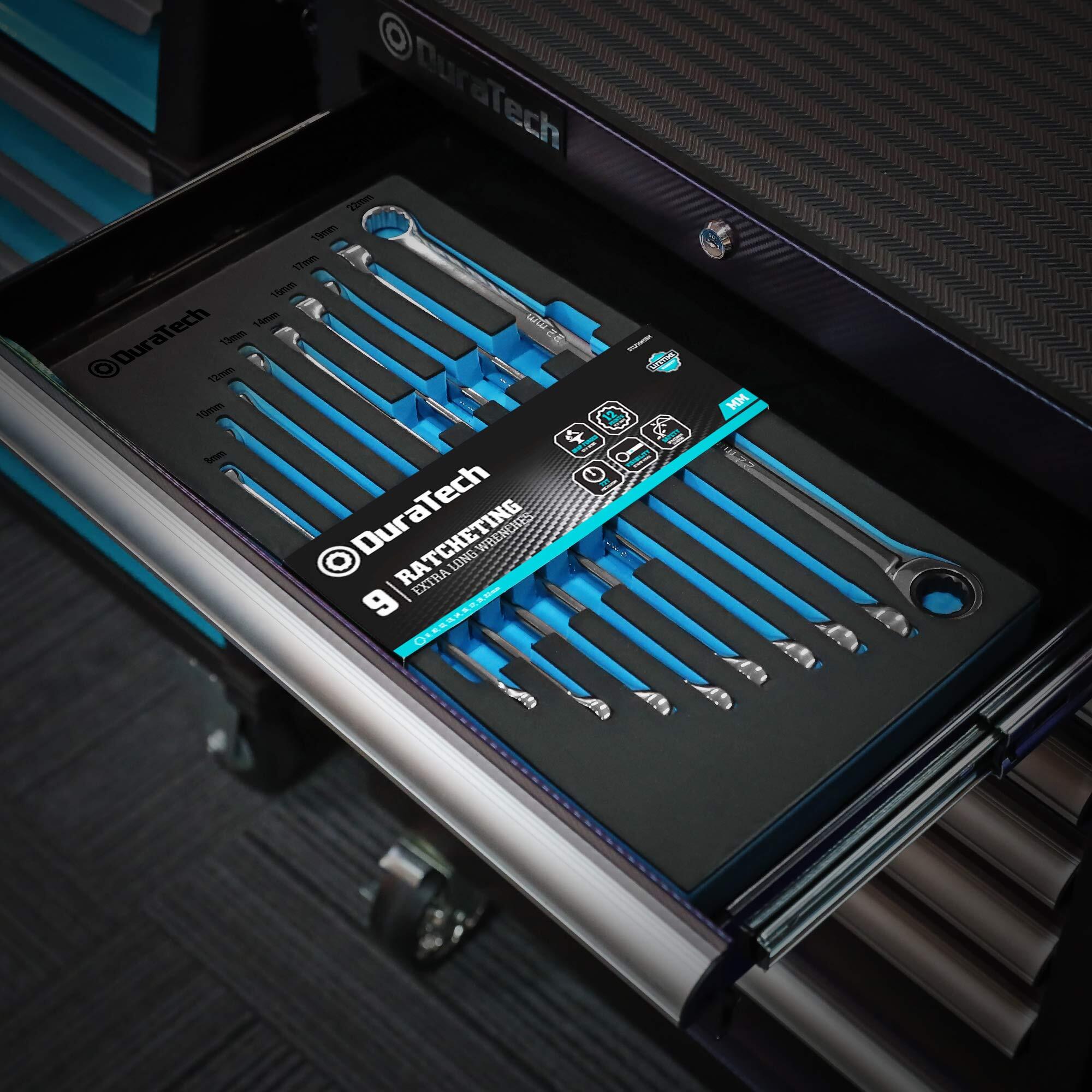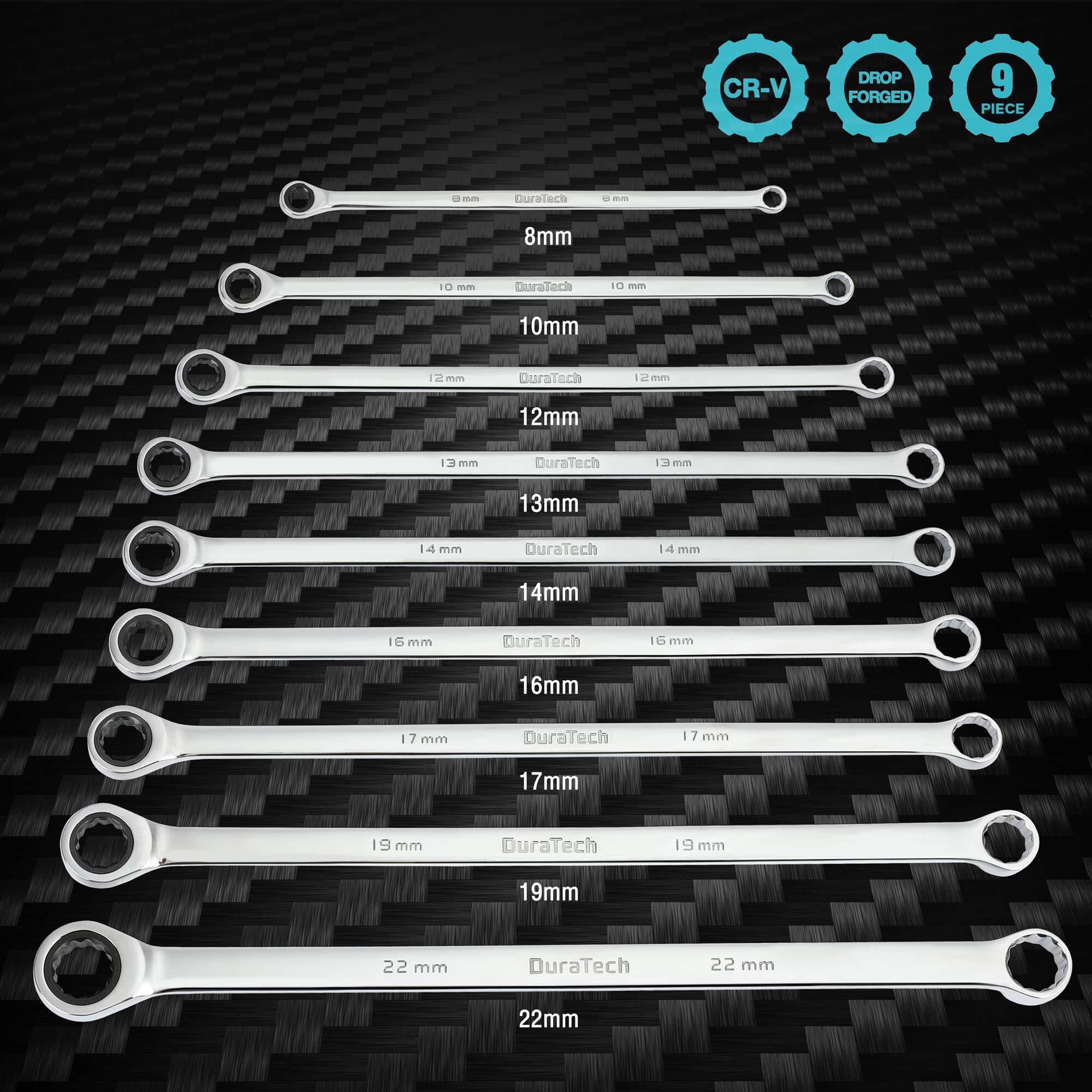 DURATECH メガネレンチセット 板ラチェットレンチ ロングタイプ ミリサイズ 片側ラチェット構造 72ギア ミラー仕上げ 8~22mm 収納ケース付 9本組