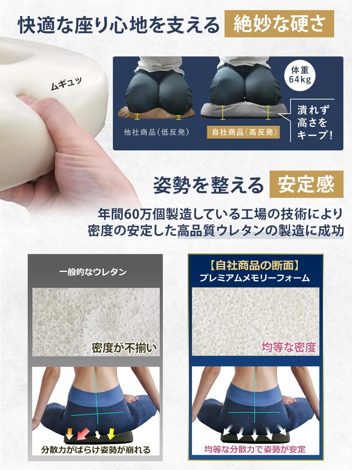 【プレミアムメモリーフォーム100%採用】円座クッション内の空間を均等にすることで、全体の硬さが安定し体圧をまんべんなく分散させ、お尻への負担を抑えてくれます。
