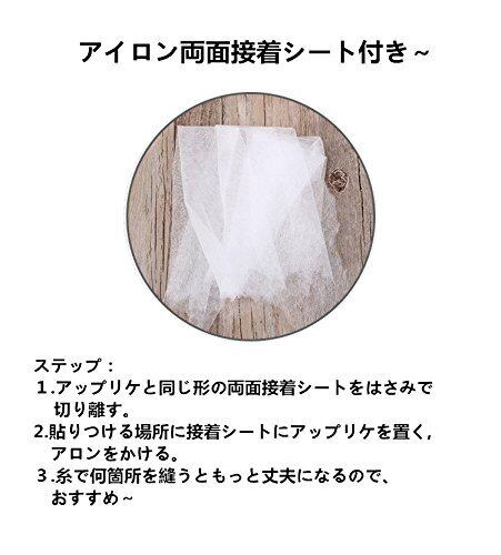 使用方法:備え付きの両面接着シート(繊維糊)をアップリケと同じ形にカットして、貼り付ける場所に接着シートにアップリケを置く、濡れタオルで当て布をしてアイロンを10秒ぐらいかけると完成です。