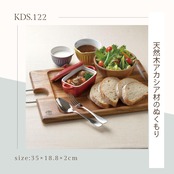 アカシアの木目は、色の濃淡がはっきりしており、主にナチュラルな直線ですが、時として絡み合うこともあるので、それがアクセントになってぬくもりのある高級感を演出します。色や木目が商品ごとに違うのも天然木ならではの特徴。使い込んでいくうちに味わいが増していきます。材質は、硬く粘りがあり、衝撃や曲げにも強いと言われております。また、成長が早いのも特徴なので、エコ素材としても注目されてきています。木製品は熱を伝えにくいので、温かい料理は温かいまま、冷たいデザートは冷たいまま、料理を更に引き立てます。陶器とは違い、軽くて割れにくいので、お子様からのお年寄りの方まで気軽に安心してお使いいただけますので、ヨーロッパの家庭では日常的に使われています。