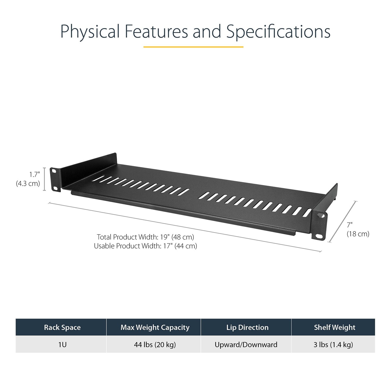 1Uラック棚板。EIA-310互換のサーバーラックまたはキャビネットに、奥行き177.8mm(7インチ)のストレージスペースを追加します。放熱スリット付き棚板は、通気性を改善しラック内の温度上昇を抑えます。