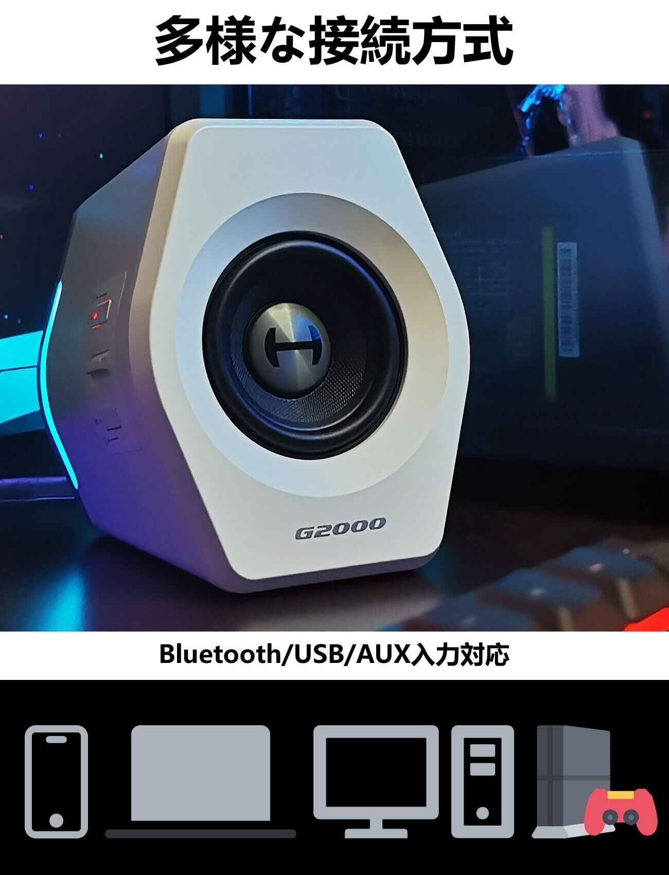 多様な接続方法:Edifier G2000スピーカーは、Bluetooth、USB、AUXの3種類の接続方法に対応しており、様々なデバイスと互換性があります。音源を自由に切り替えることができます。