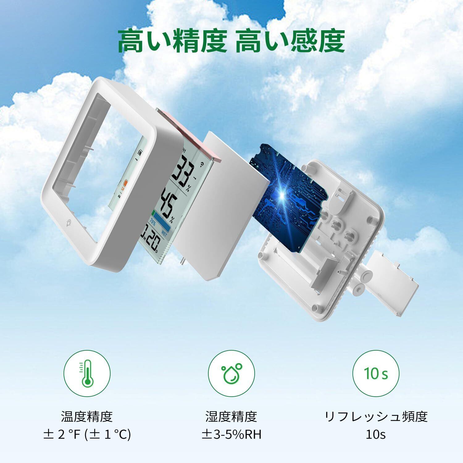 【高精度・高性能】デジタル温度・湿度の測定値は10秒ごとに更新され、最新のデータを提供します。広い測定範囲 室内温度範囲:-10℃~60℃(14℉~140℉).屋外温度範囲:-40℃~60℃(-40℉~140℉)。湿度:10%~99%;屋内外の測定精度:±1℃(温度),± 3-5% RH(湿度)。