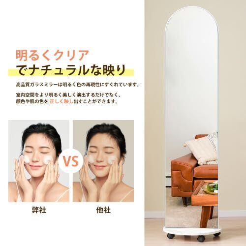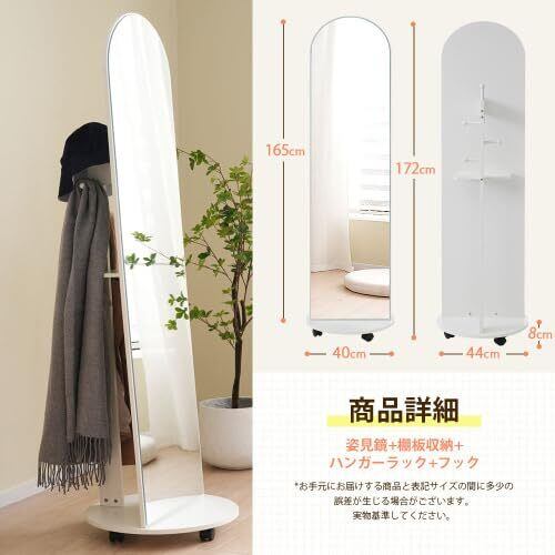 オーエスジェイ(OSJ) 姿見鏡 ハンガーフック アーチ形 ハンガーフック付き鏡 ハンガー 360°回転可能なキャスター付き 北欧 収納付き 衣類収納 隙間収納 リビング 玄関 飛散防止加工 ホワイト 172*44CM