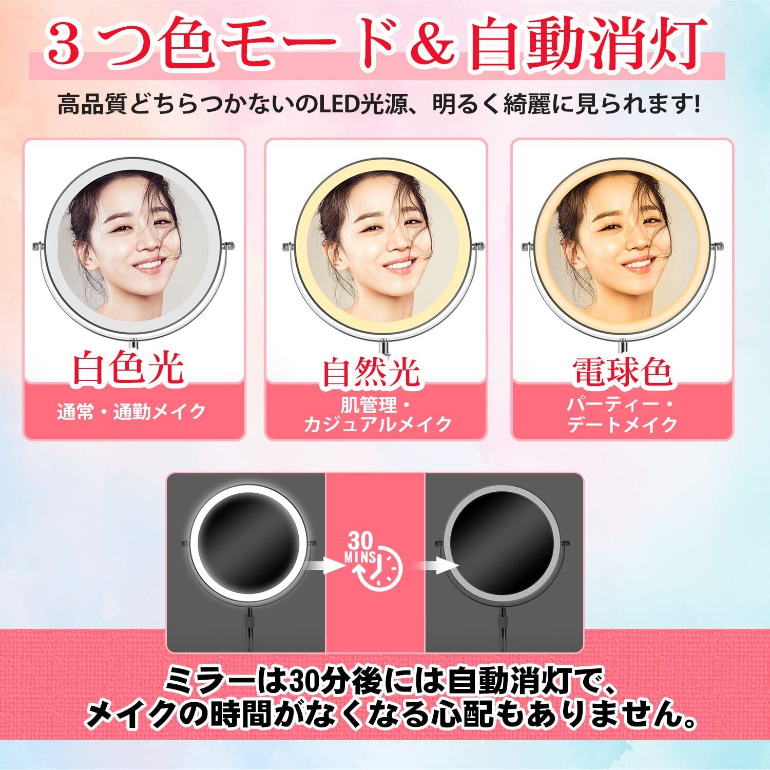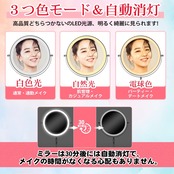 【3つ調光機能/無段階調光/自動消灯&USB充電式】ライト付きミラーは昼光色・昼白色・電球色の3色のLEDライトが搭載されていて、本体面のタッチパネルを押すと、メイクする場所やお部屋の明るさなどに応じて使い分けることができます。化粧鏡のledライトは明るくて目に優しいで、目元や口元など凹凸の部分に影をつけることなく均等に顔を明るく照らし、メイクムラを防ぎます。なお、女優ミラーが無段階調光機能あり、タッチ式調光パネルを長押しと、ミラーライトの明るさを無段階調光できます。なお、自動消灯機能がついており、ミラーは30分後には自動消灯で、ライトの消し忘れがないので便利です。または、化粧鏡は便利なUSB給電式、2000mAh充電可能なリチウム電池を内蔵します。モバイルバッテリーやパソコンなどのデバイスに接続して充電可能。4時間充電になると、最大輝度は4-6時間連続して動作でき、どこでもメイクができる。