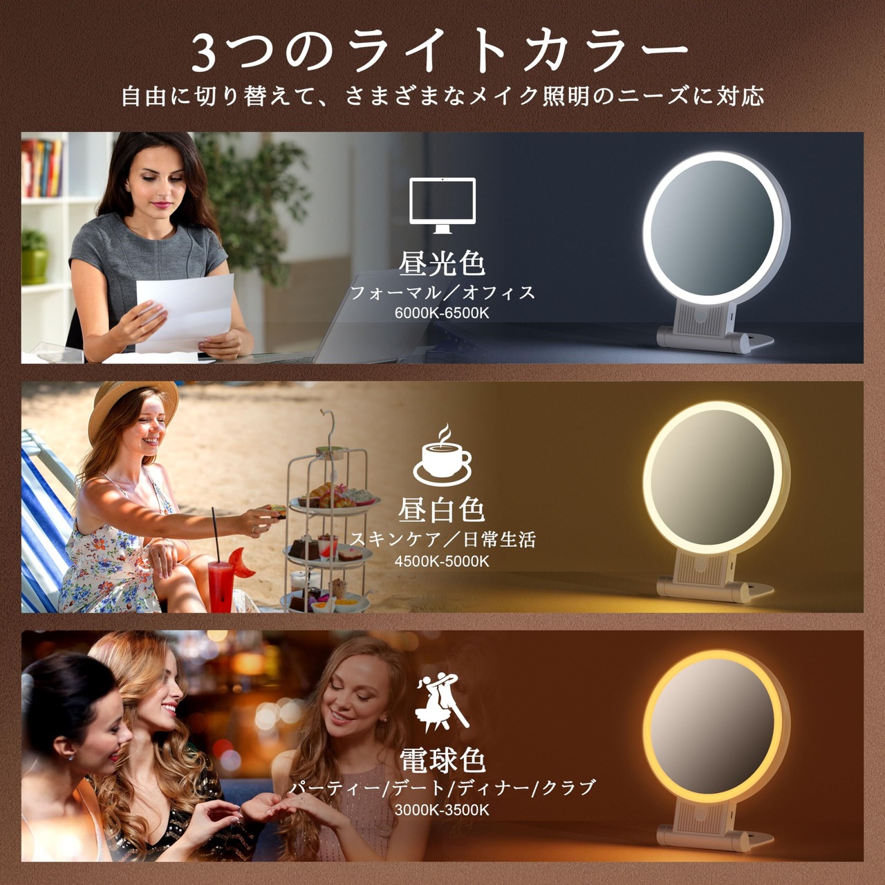 【3色のライト・無段階調光】Auxmir化粧ミラーは昼光色・昼白色・電球色の3つの照明モードを備えています。昼光色が自然光に近い明るさで肌の色を忠実に再現し、昼白色は室内照明に合わせた快適な色調を提供し、電球色は暖かみのある雰囲気を作り出します。それに、タッチボタンを利用することで、手軽に操作を行うことができます。ボタンを短く押すとライトをオン/オフし、長押しすると滑らかな無段階調光が可能です。どのような状況でも、最適な光量でメイクを仕上げることができます。