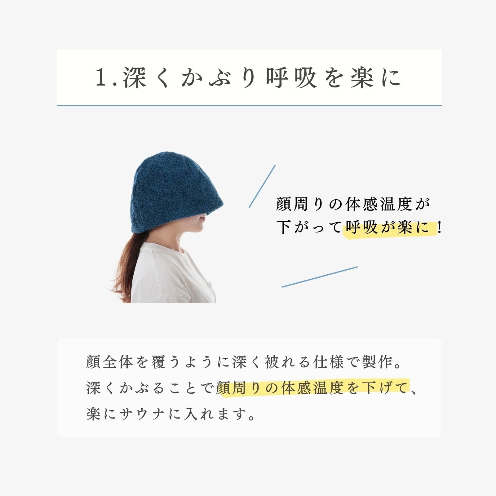 【呼吸が楽になるサウナハット】他のサウナハットよりも深く被ることができ、顔周りの温度を下げサウナハットが呼吸を楽にしてくれます。
