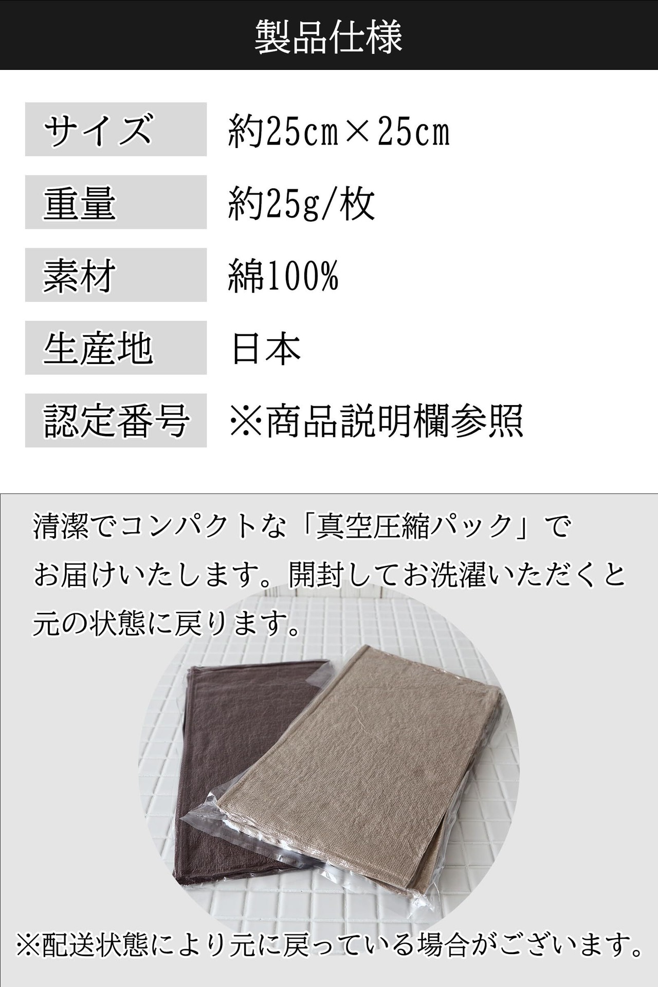 サイズ:約25cm×25cm 重量:約25g/枚 デザイン(認定番号):ネイビー(第2021-1129号)、ホワイト(第2022-1032号)、ミックスグレー(第2021-918号)、ピンストライプグレー(第2021-917号)、リバーシブルネイビー(第2022-1326号)、ブルー・グリーン(第2022-1325号)、しましまネイビー・しましまグレー(第2022-2634号)、テールグリーン・ブラック(第2023-2689号)、無地Aアソート4枚(第2021-945号) 素材:綿100% 生産地:日本(愛媛県今治市) ※モニターの発色の具合により実際のものと色が異なる場合がございます。 ※清潔でコンパクトな圧縮パックでお届けいたします。開封してしばらくすると空気を含み、元の状態に戻ります。配送状態により元に戻っている場合がございます。