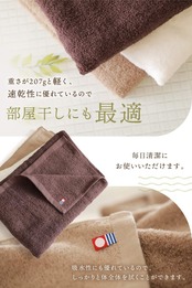 重さが207gと軽くコンパクトなので、厚手のタオルと比べるとお洗濯の量も少なくなります。また、速乾性に優れているので部屋干ししても臭いがしにくいのもgood。耐久性がよいので気軽に毎日洗濯できて、清潔にお使いいただけます。