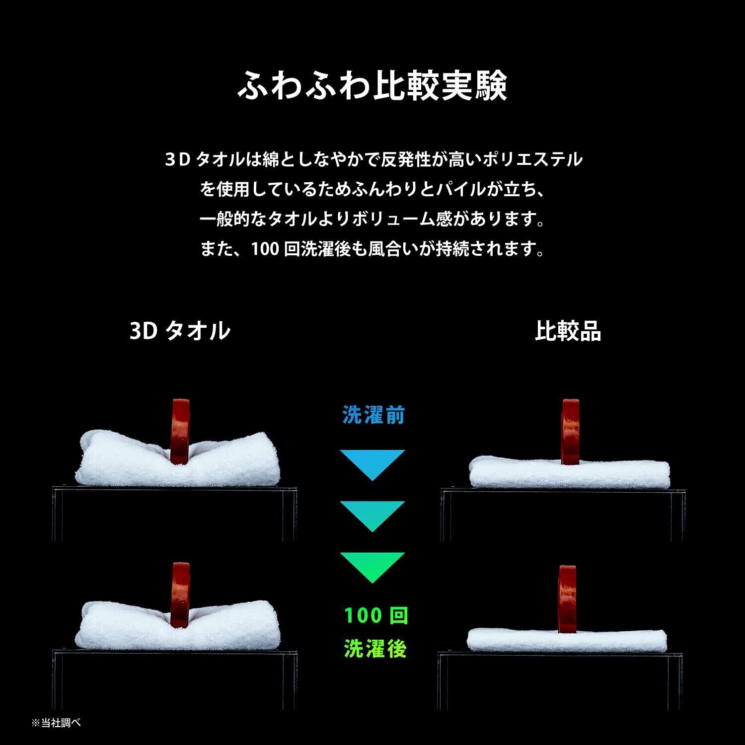 【速乾なのにふわふわボリューム】柔らかい肌触り、ボリューム感を実現させるため、高い技術力を駆使し、東レとの共同企画で、ポリエステルの芯糸に綿を巻きつける特殊複合紡績糸"3D糸"を開発。この3D構造の糸を使用することで、高いハードルをクリアすることに成功しました。この糸はパイルがふんわりと立ちあがる構造のため、従来の速乾性タオルでは得られなかったボリューム感を実現するとともに、直接肌に当たる部分は綿のやさしいふんわりとした肌触りとなっております。また、この糸を使用したタオルは、洗濯を繰り返しても毛羽が落ちにくく、やさしい肌触りを長期間お楽しみいただけます。
