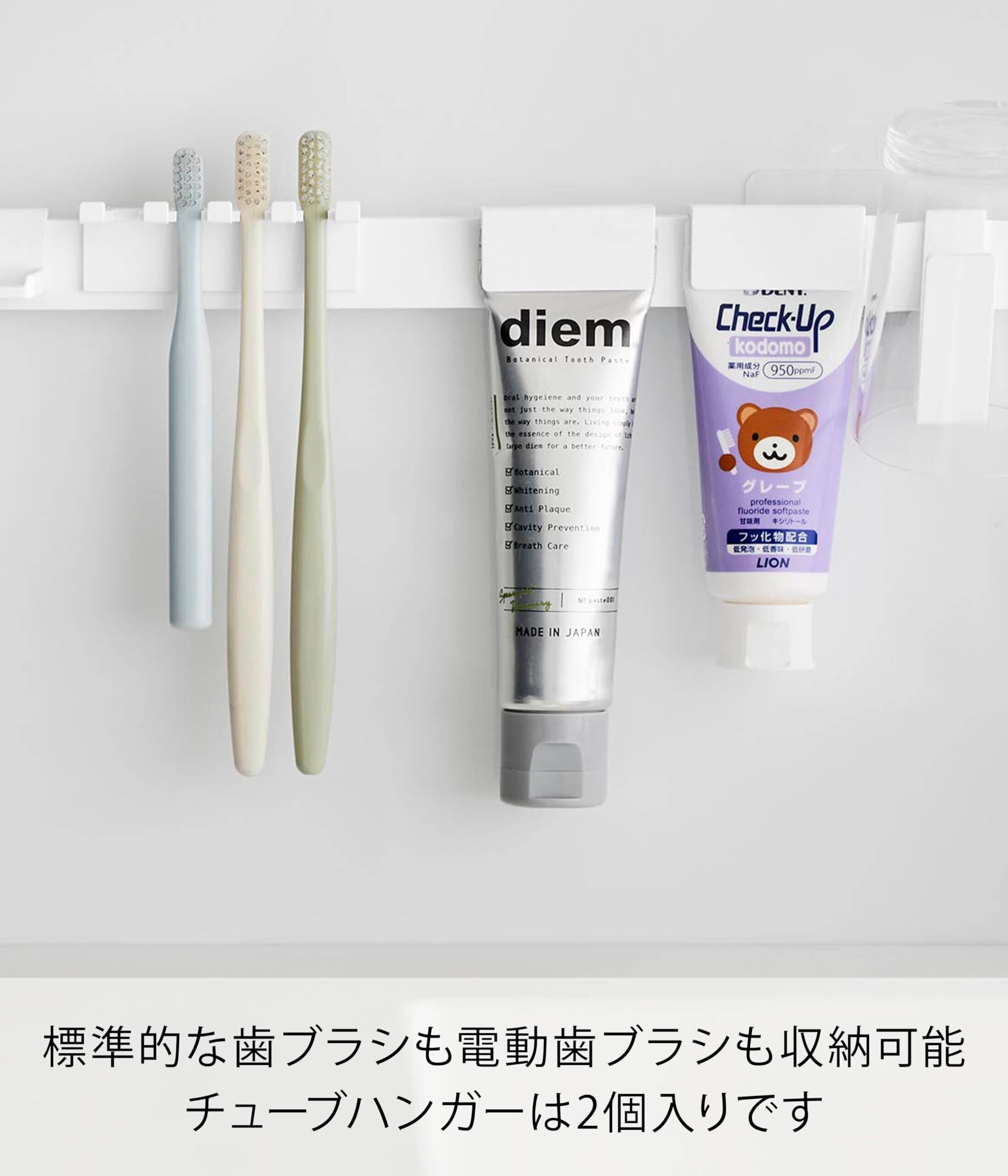 歯ブラシハンガーは収納部分の幅が奥と手前で違うので歯ブラシや電動歯ブラシのサイズに応じて使い分けできます。