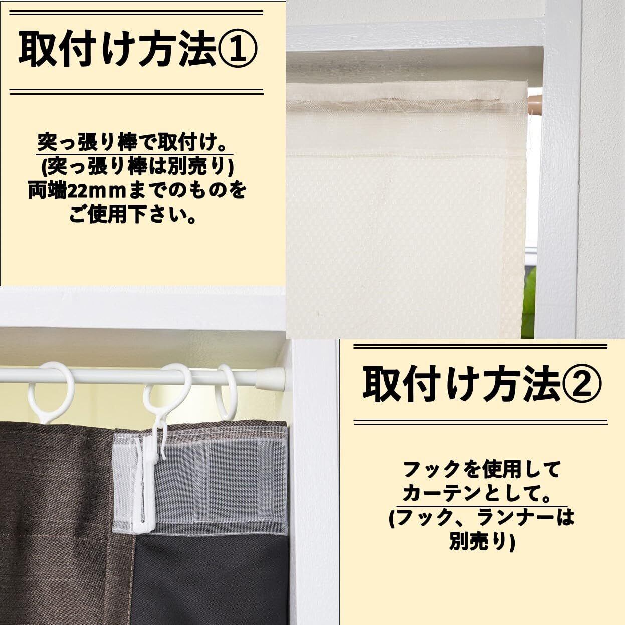 【取付方法】 カーテンフックを使用した取り付け、突っ張り棒を使用した取り付けが可能です。*カーテンフックは75mmのカーテンフックを7本、突っ張り棒は両側の直径22mm以下を別途ご用意ください。