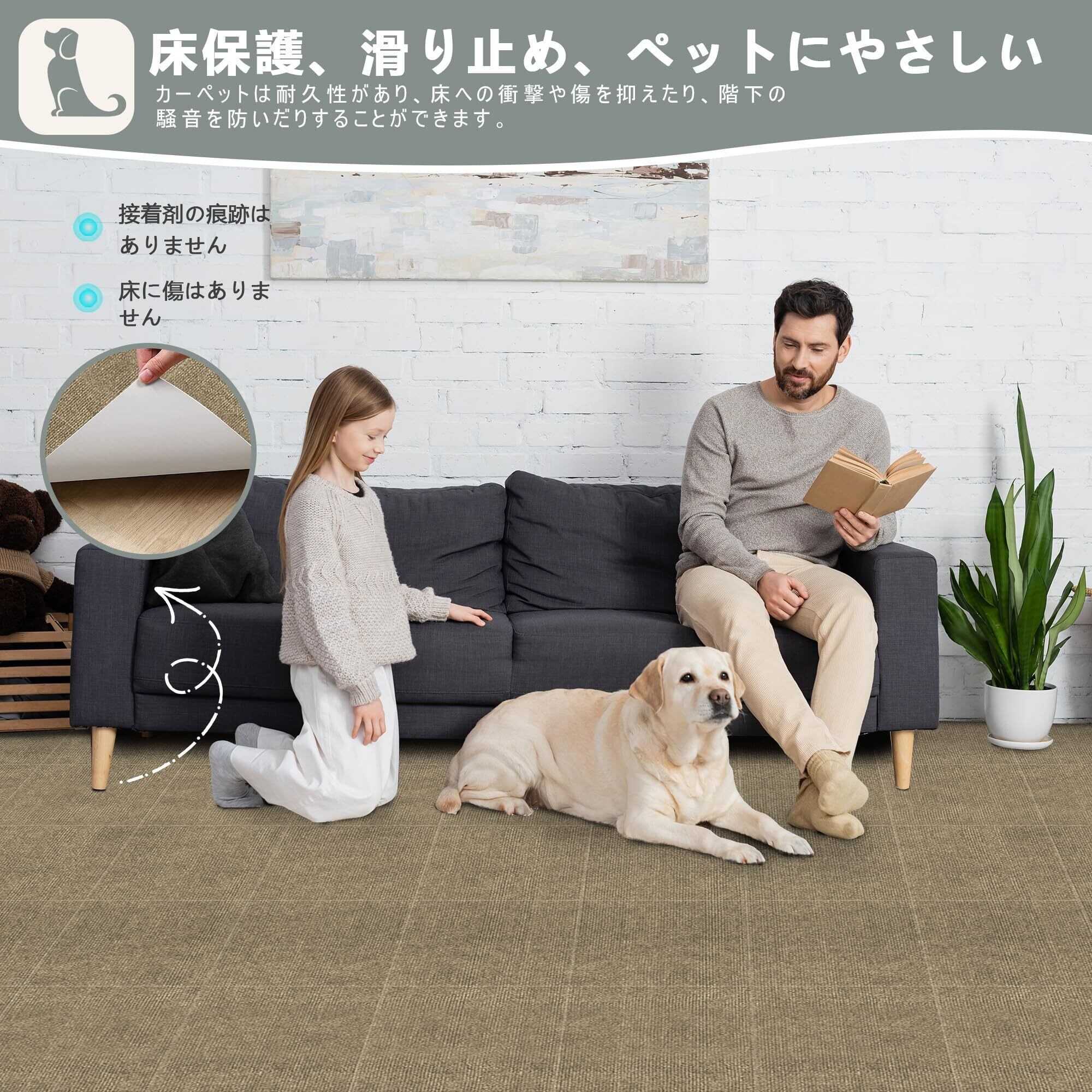 【改良超強な吸着力】 タイルカーペットは特殊な裏側の構造で吸盤のようにピタッと張り付くで、おくだけでもズレにくいです。上で走り回っても、掃除機をかけても、ずれにくくストレスがありません。しかも、ピタッと張り付くでも、テープのようにべたべたせず、跡が残りにくいです。