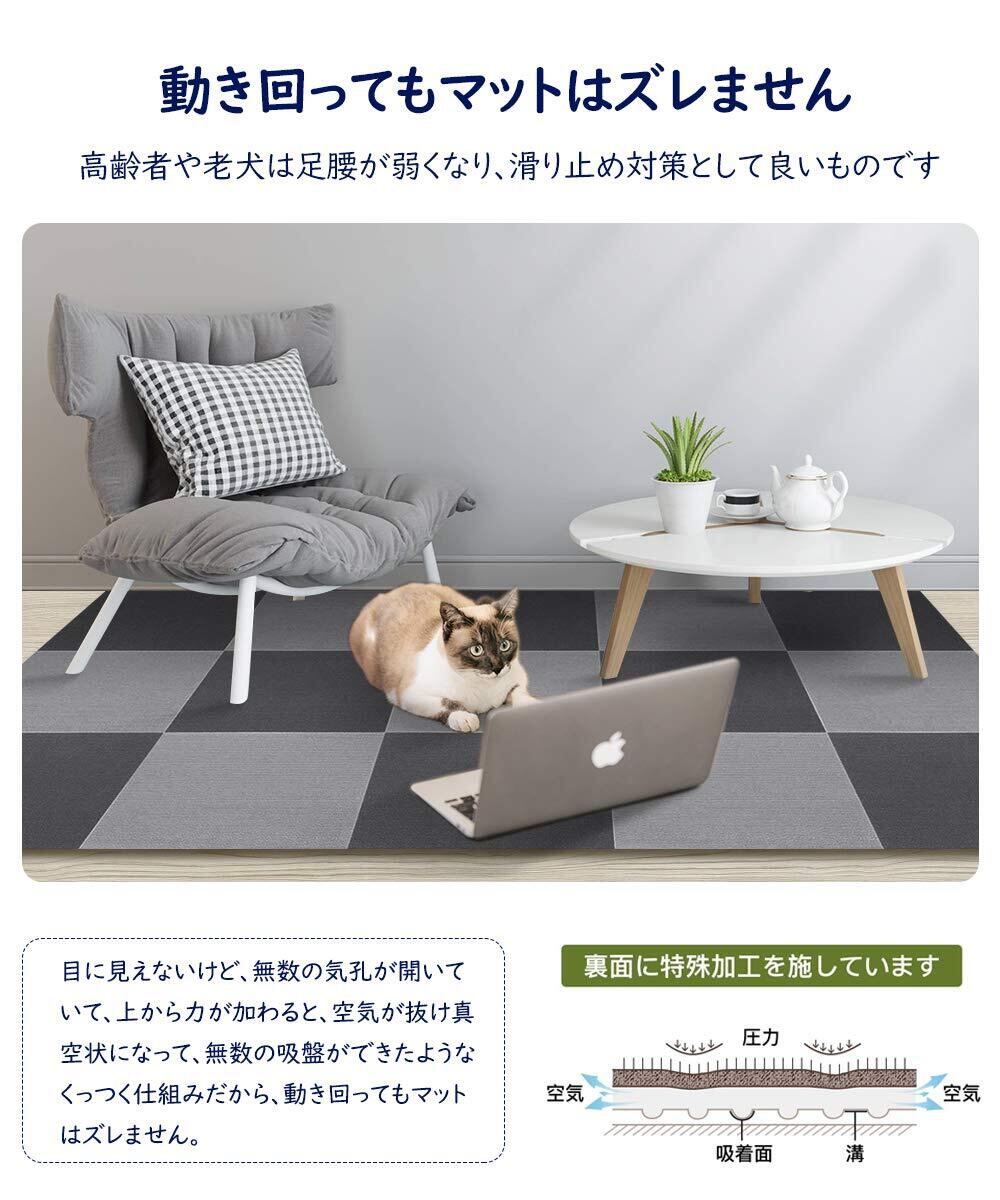 【ずれない 吸着タイルカーペット】空気が抜け真空状態になって無数の吸盤ができたようなくっつく仕組みだから、動き回ってもマットはズレません。厚み約4mmのマットですので、つまずきにくく、扉の開閉の妨げにもなりません。引っ掛かったりする恐れが少なくなる。高齢者や老犬は足腰が弱くなり、滑り止め対策として良いものです。