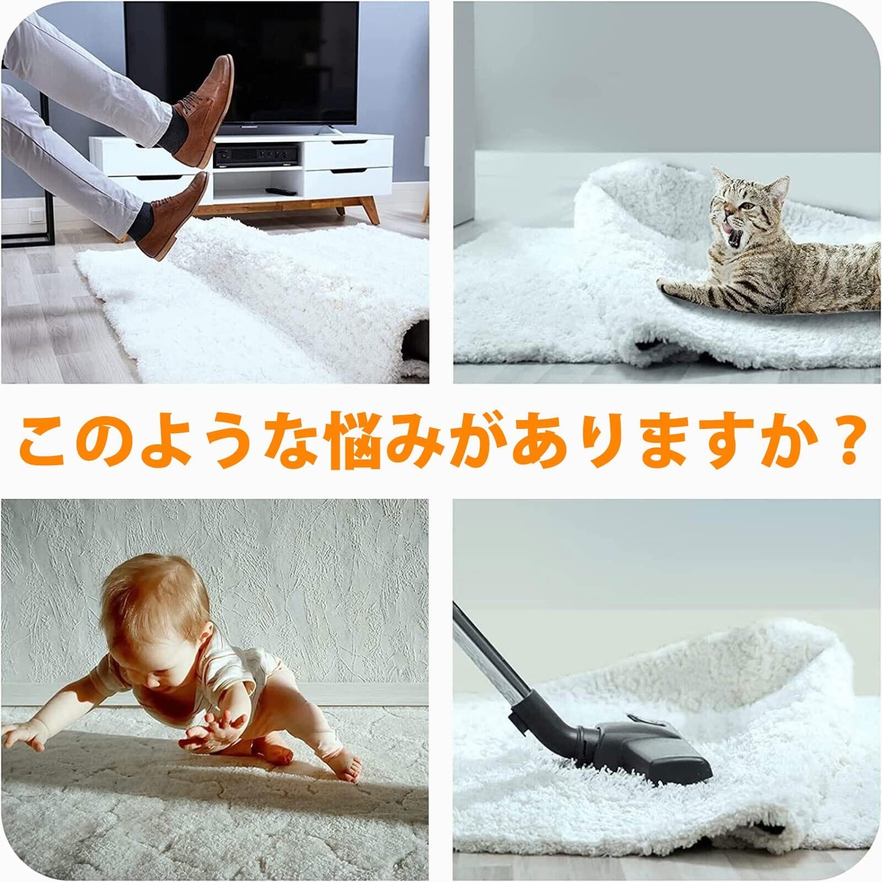 【繰り返し利用でき/床に傷つけない】ゆかの側は水で洗うと粘性が回復し、付いても濡れた布で拭き取ったり、カーペットに貼ったまま水で洗ったりすることができます。自然に乾燥させてから、吸着性も落ない、繰り返して利用できます。剥がす時にノリが残らず、床に傷つける心配がなく、賃貸にお住まいの方でも安心してご使用いただけます。ラグの側の両面テープはメッシュ加固で従来品より粘着力がもっと強くなります。