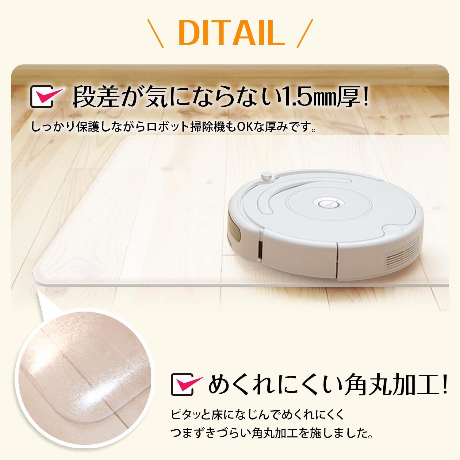 【傷つきにくいPVC素材】 布では落ちない液体の汚れも、サッと一拭きすることで落とすことができます。また、厚さが1.5mmと段差を気にせずお使いいただけます。透明なので、景観を阻害せずにインテリアにもしっかり馴染みます。
