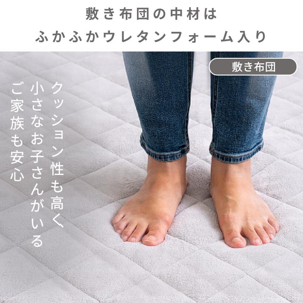 素材【敷き布団】表生地:ポリエステル100%(マイクロサンゴマイヤー生地使用)、裏生地:ポリエステル100%(不織布生地使用)、中材:ポリエステルわた、ウレタンフォーム
