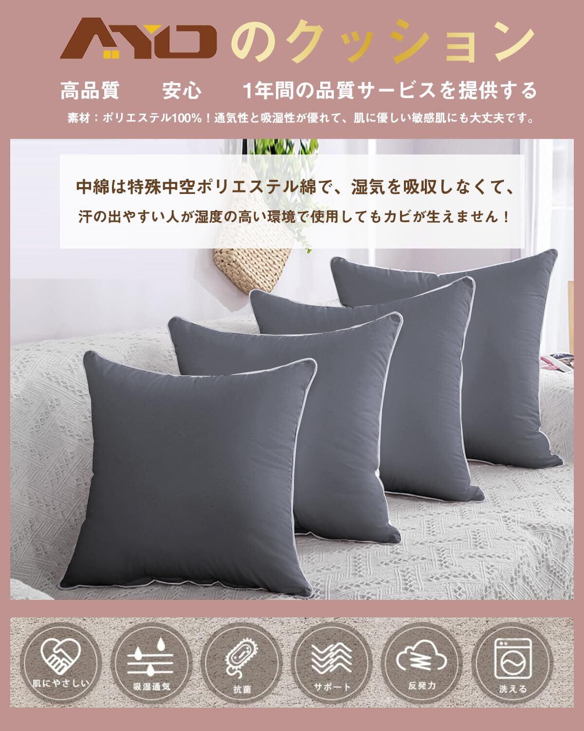 「仕様」 クッション中身:45x45cm 2個セット;カラー:グレー;対応カバーサイズ:40~45cmです。AYO ショップは1年間返品を用意いたしました。ご購入日から1年間以内に商品期間となり、万が一商品不良の場合、開封後の商品や、ご洗濯後の商品など構いません。ご連絡いただき次第、迅速に交換、返品及び返金を対応させていただきます。お客様のニーズより満足できるよういいサービスを提供させていただきます。