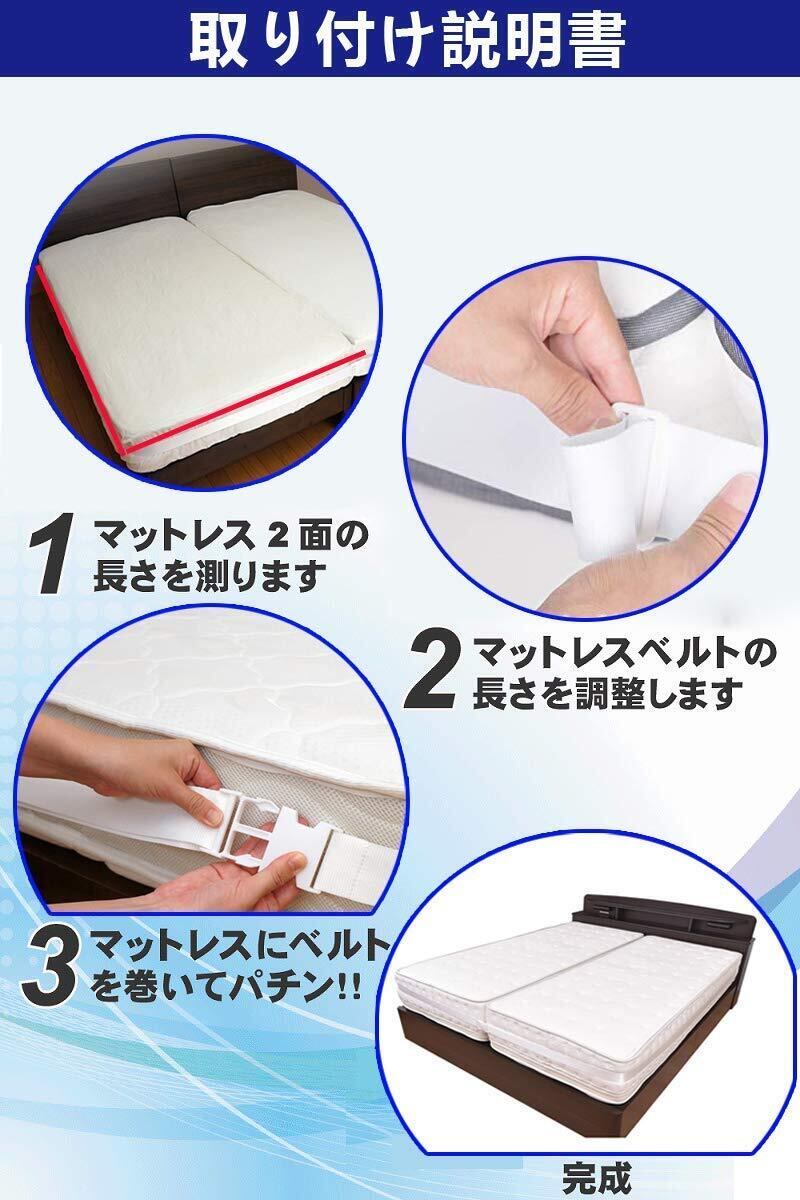 【かんたんに取付け】①マットレス2面の長さを測ります。②マットレスベルトの長さを調整します。③マットレスにベルトを巻いてパチンとバックルを締めます。たったこれだけ、わずか3ステップで取付け完了です。(ただし長さがあるため、1人での取りつけは困難です。正しく装着するためにも、2人以上での作業をお勧めします。)