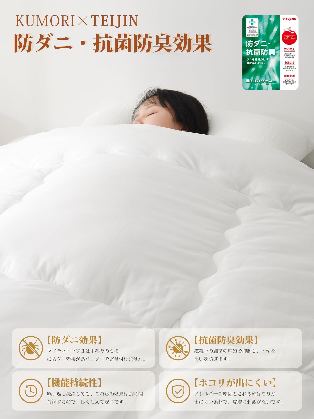 【防ダニ・抗菌防臭】中綿には防ダニ・抗菌・防臭効果のある帝人「マイティトップII」を50%使用しています。長く肌に触れる布団をいつも清潔にご使用できます。