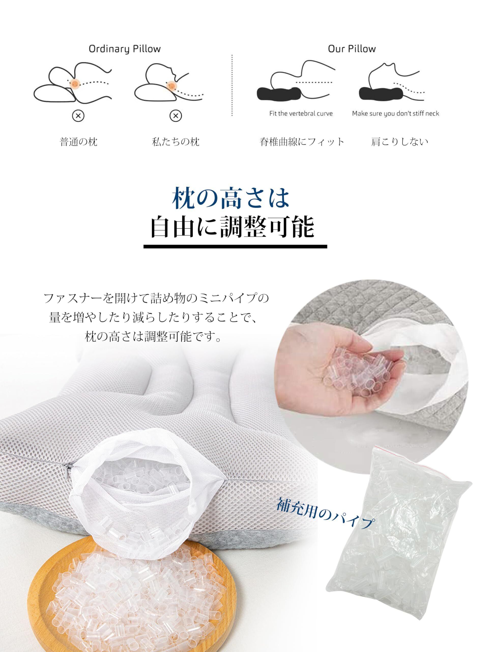 【枕の高さを自在に変更 爆睡の秘密】新開発のパイプ枕は、自分で高さを変更できるのは枕選びの大きなポイントです。枕の合う合わないは千差万別だから、ファスナーを開けて詰め物のパイプを出し入れするだけなので簡単にできるのも嬉しいです。高さを上げる場合は、付属の補充パックのパイプを一握りずつ入れてご利用ください。寝ている間に仰向けでも横向きでも、どんな姿勢になっても楽なのてしょう、夜中に目が覚めなくなって、本当に朝起きて快適です。表面は柔らかいニット生地で作られ、内側素材は通気孔付きの低反発パイプを組み合わせており、暑い夏でも寒い冬でも、頭をスッキリと涼しく爽やかな睡眠環境に保つことをお勧めします。
