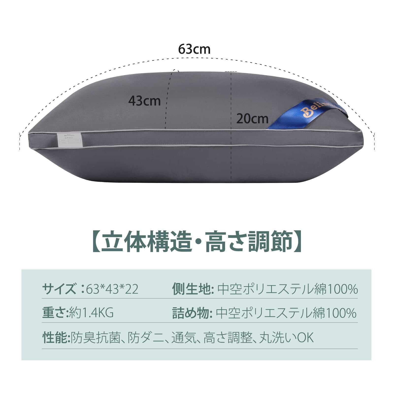 枕 Belinna 枕 首が痛くならない低反発 低め 柔らかい枕 安眠枕 首枕 睡眠枕 ホテル仕様 高さ調整可能 高反発 丸洗い可能 横向き対応 ストレートネック 枕 まくら 枕 43 63 グレー (長さ63cm幅43cm高さ20cm)