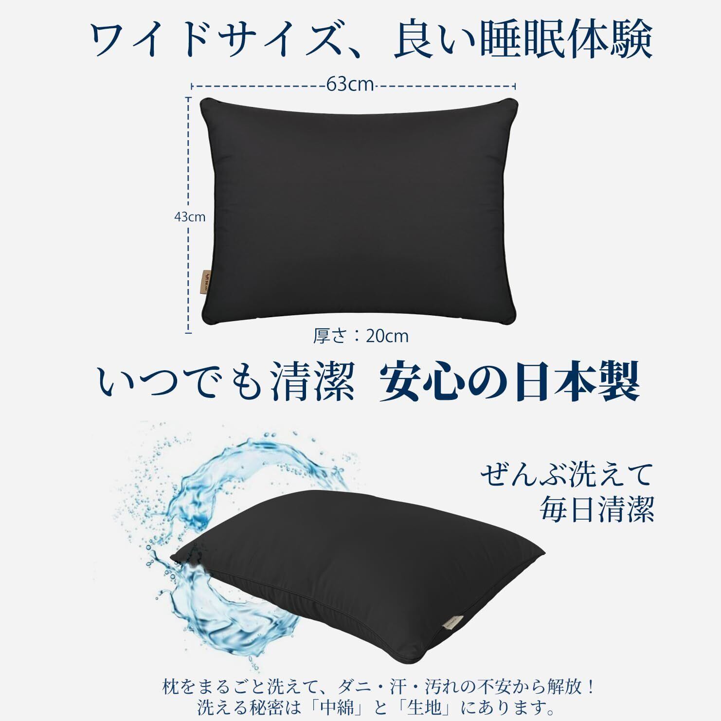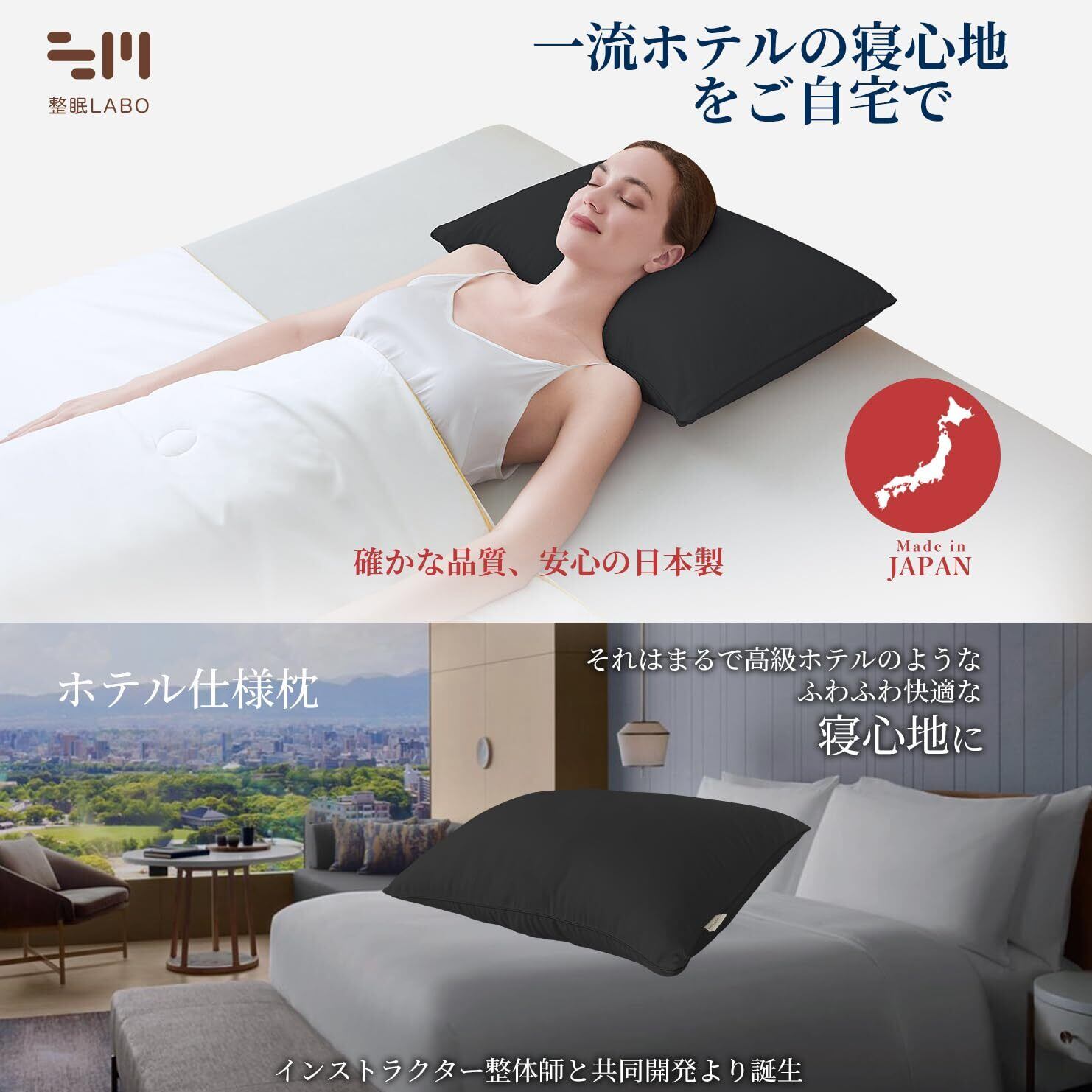 整眠ラボ 枕 まくら 日本製 ホテル枕 ふわふわ感 横向き対応 丸洗い可能 安眠 寝心地良い 63x43cm 首が痛くならない 首・肩フィット (ブラック)