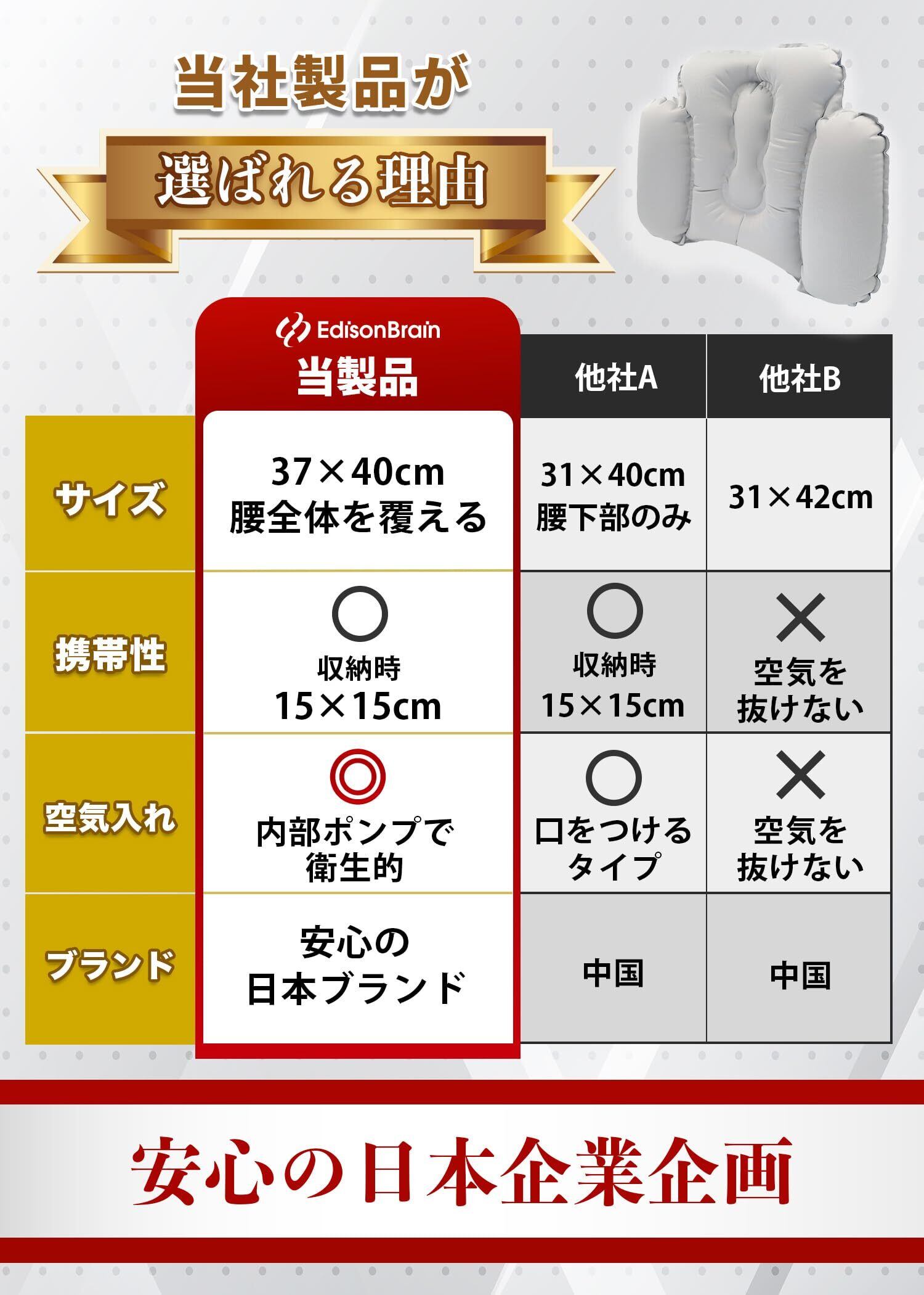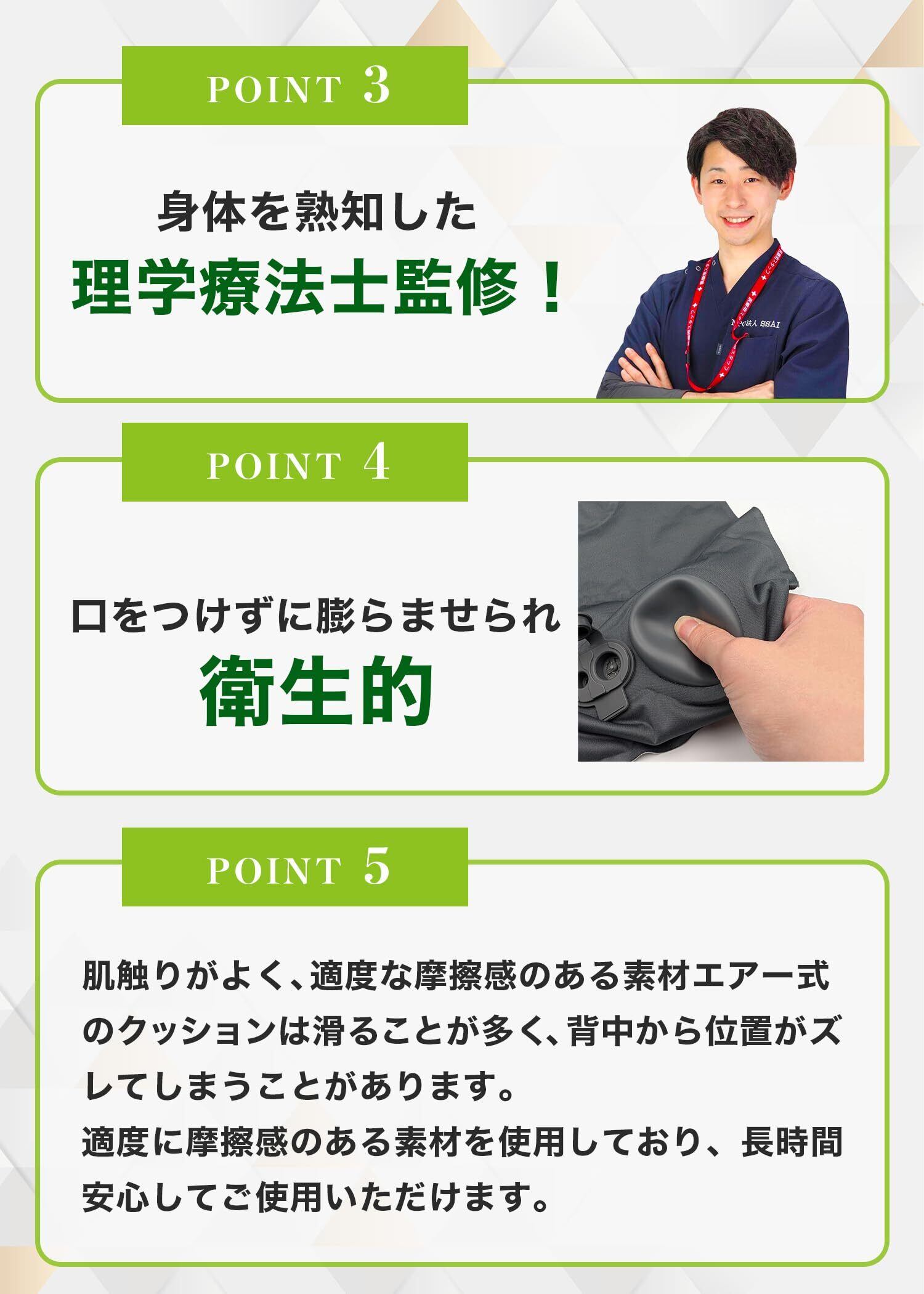 【衛生的】エアータイプのクッションは口で膨らませるタイプが多いため、衛生的ではありません。当店のクッションはポンプを内蔵しているため、口に触れることが無く非常に衛生的です。