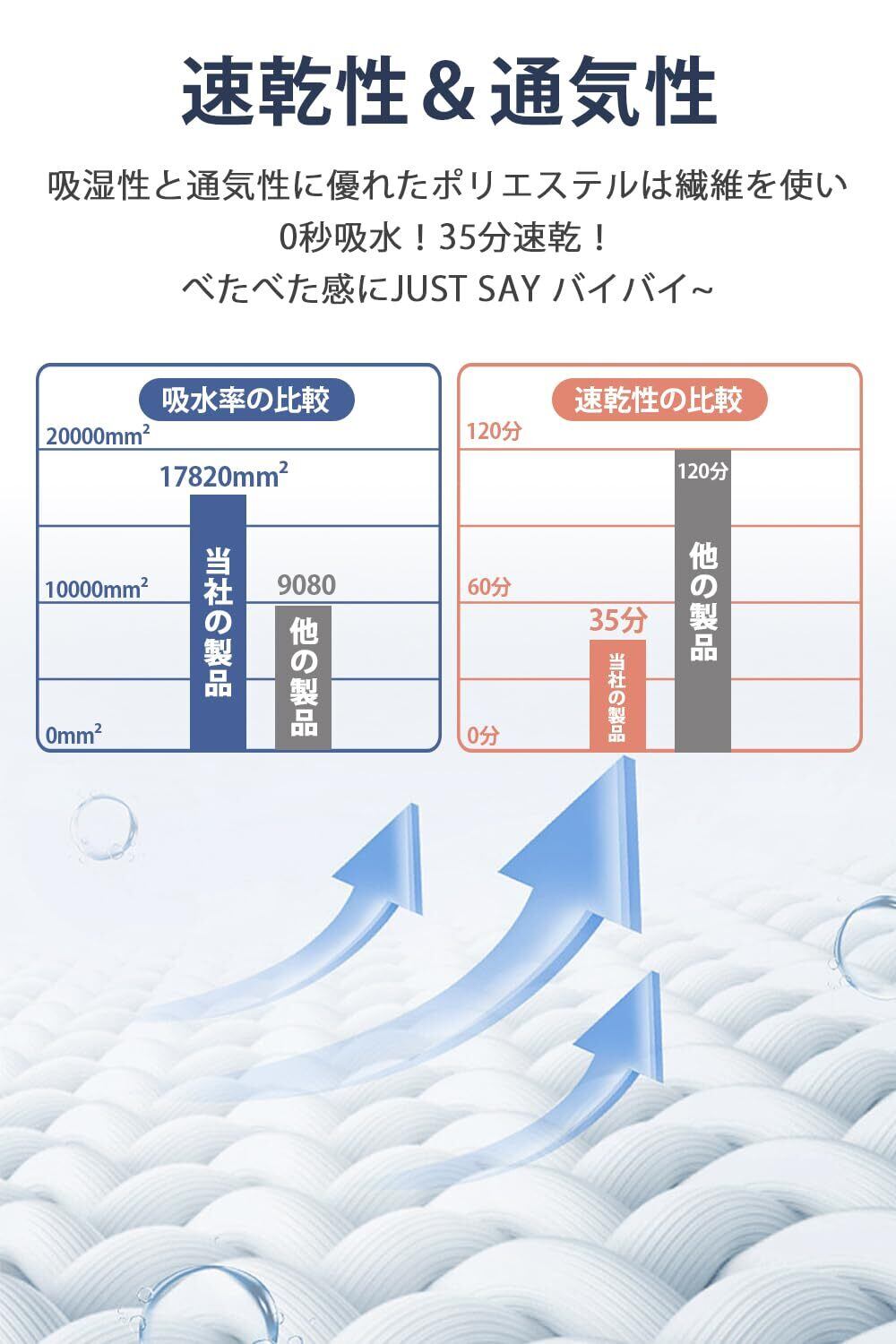 【0秒吸水&通気性抜群】吸湿性と通気性に優れたポリエステルは繊維の中に水分率がほとんど0に近いため,水や汗が生地に触れた瞬間にすぐさま拡散して蒸発します。汗ばんでも寝汗をしっかり吸収し、ベタつかず、サラッとした肌触りを保ちます。そのため、年間通し快適にお使いいただけます。