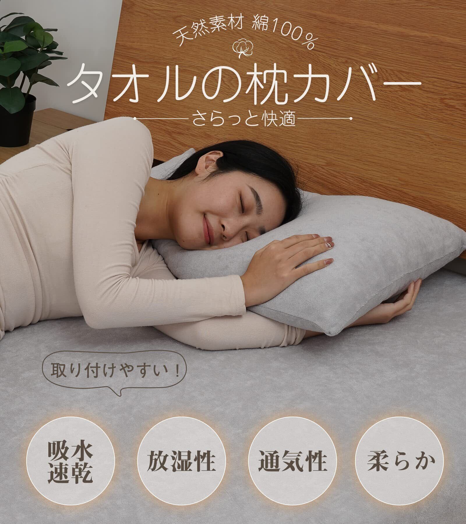 【抗菌防臭・オールシーズン使える】抗菌防臭加工で細菌の増殖を抑制し、防臭効果を発揮します。吸水性が高い枕カバーは寝汗素早く吸収し、サラサラカバーです。コットン素材のパイル地は、夏の汗対策や冬の寒さ対策に効果があり、一年中オススメ。