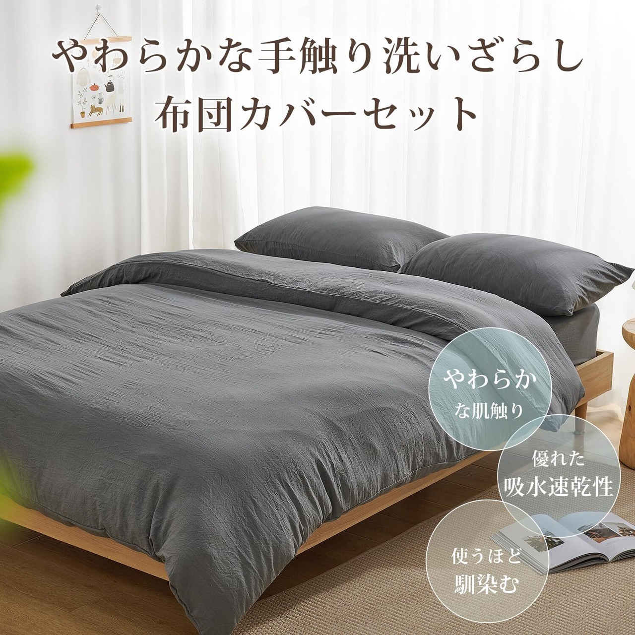 クモリ(Kumori) 寝具カバーセット 布団カバーセット 洗いざらし シワ加工 水洗い やわらか (掛け布団カバー ボックスシーツ 枕カバー)吸水速乾 丸洗いOK 肌に優しい 洗える 無地 シンプル オールシーズン(シングル・3点セット ダークグレー)