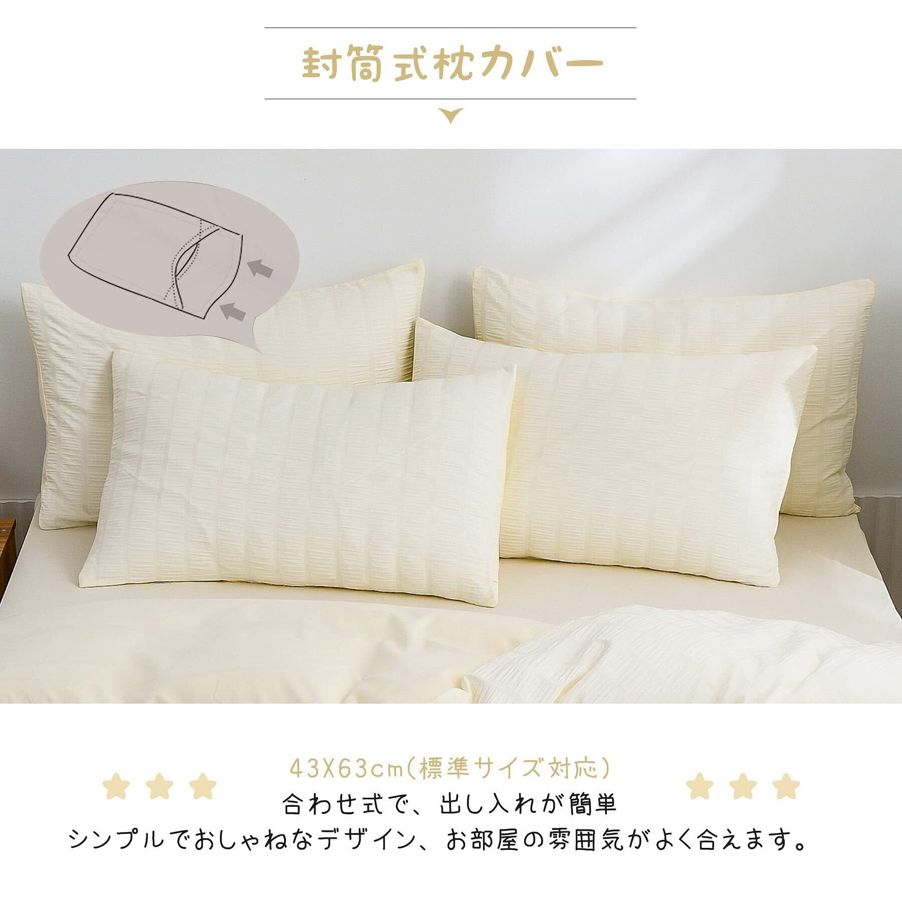 <セット内容と仕様>:「掛け布団カバー(1枚)」:片側にファスナー使用 / 布団留めひも6ヶ所付き ・ 「ボックスシーツ(1枚)」:全周ズレ防止ゴム付き / 通常サイズより大きめなので、高さ3-28cmの敷き布団とマットレスの底まで包む可能 ・ 「枕カバー(1枚)」:43X63cm(標準サイズ対応)合わせ式で、出し入れが簡単。サイズ詳細等の測り方はスタッフ間で統一、徹底はしておりますが、若干の誤差(約2~3cm前後)がある場合がございます。