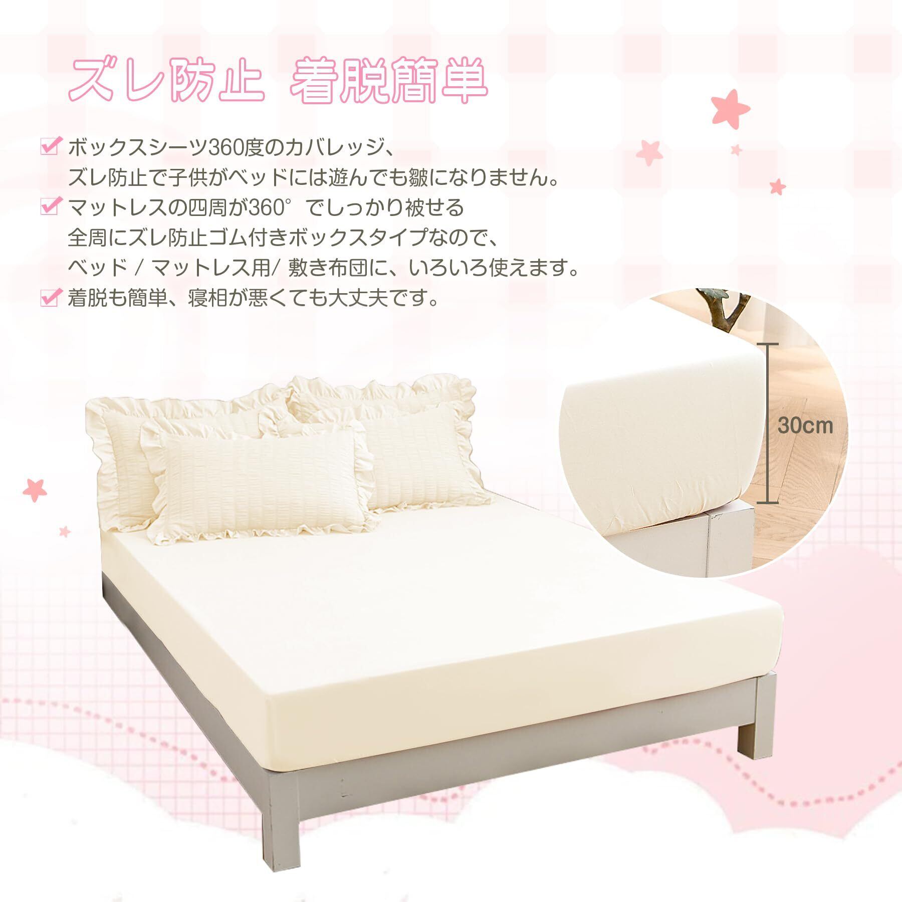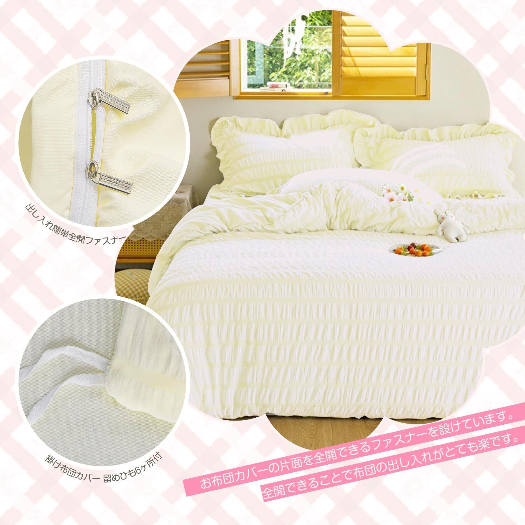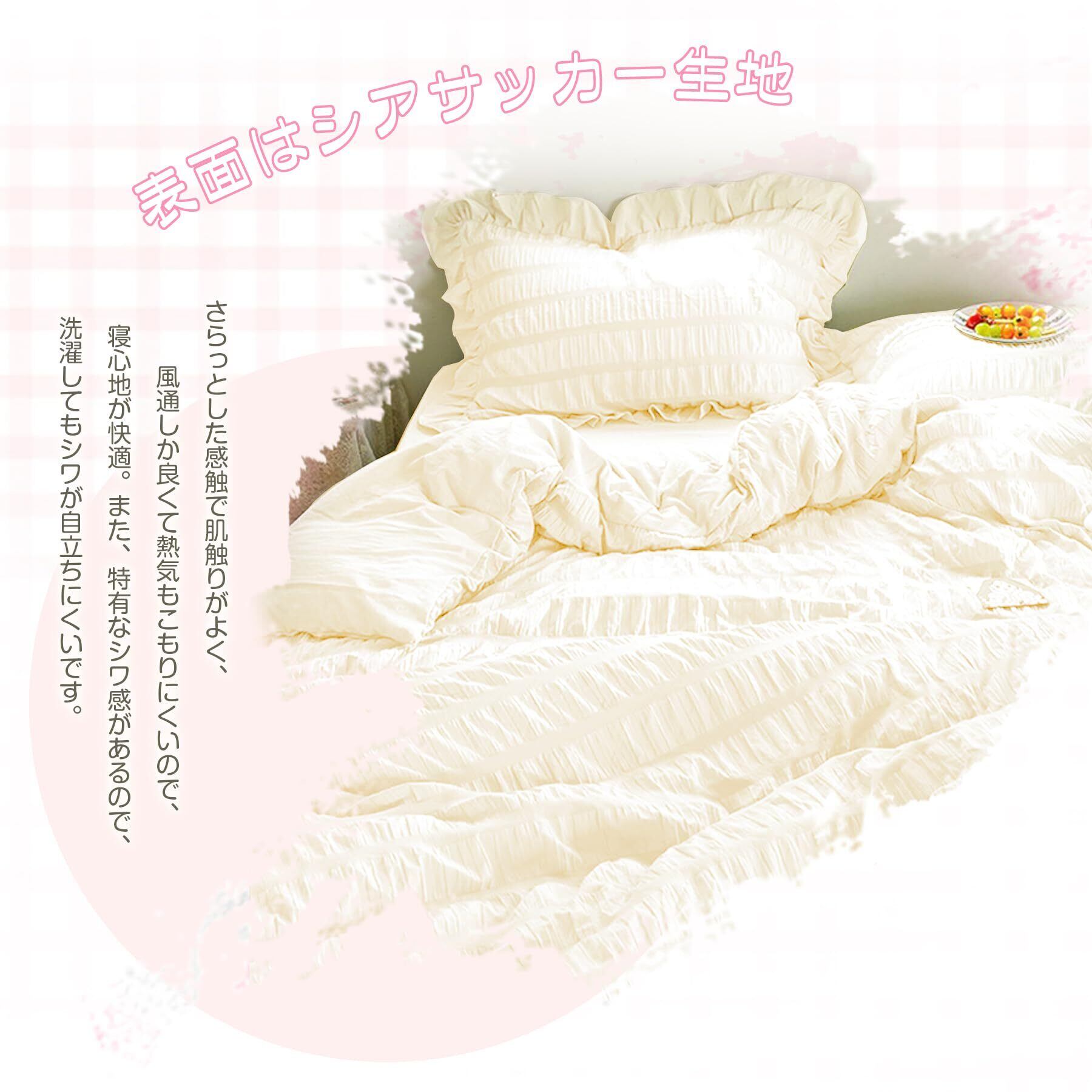 【シアサッカー生地 大人かわいい上品な フリル】 ポリエステル100%、綿素材と比べてシワになりにくく、シアサッカー生地で、肌触りが良く、快適で心地よくご利用いただけます。波のような縞ができていて柔らかな肌触りで1年中でご愛用いただけます。おしゃれで甘すぎない程よいフリル感に仕上げました。いつもの寝具にセットするだけで、お部屋を華やかに演出します。