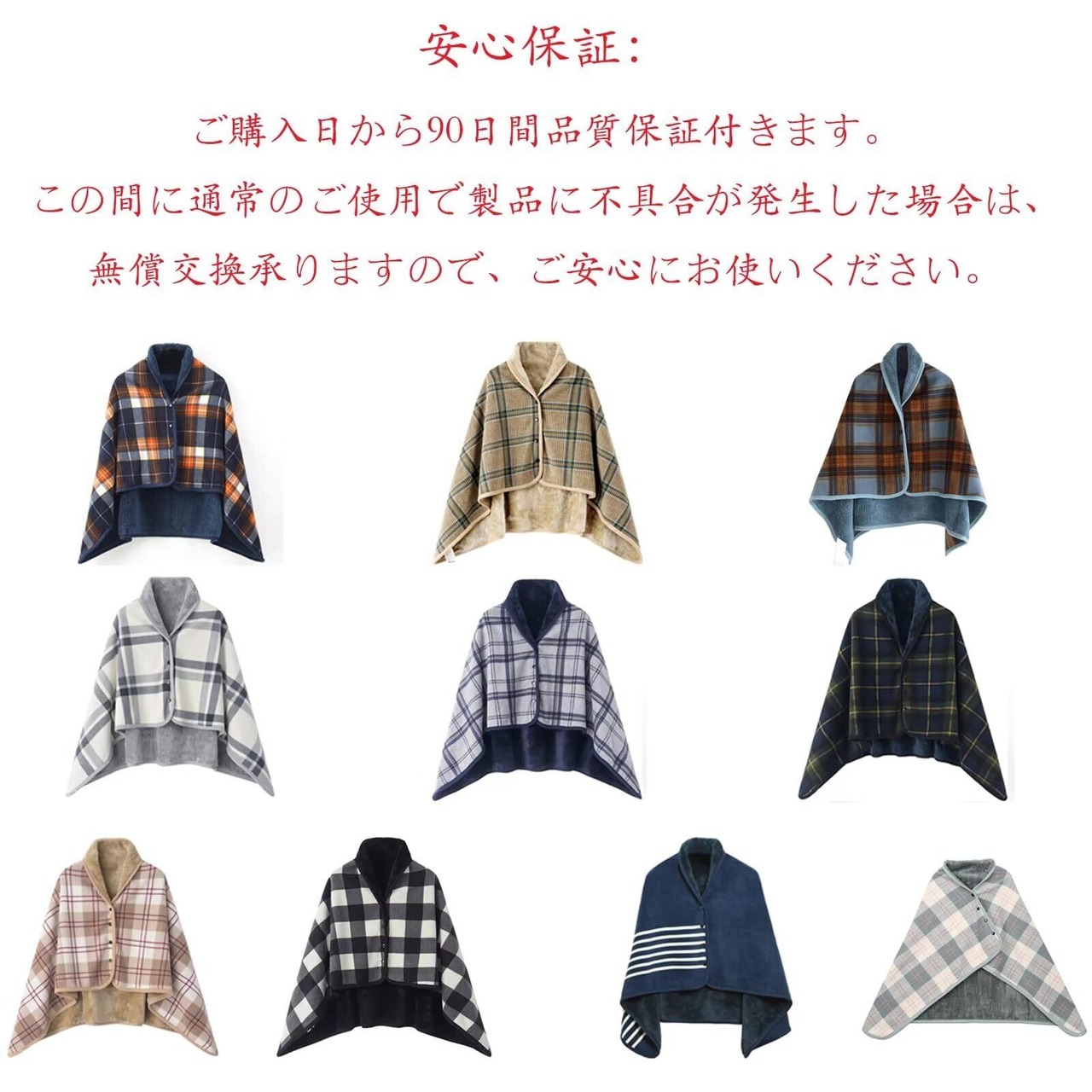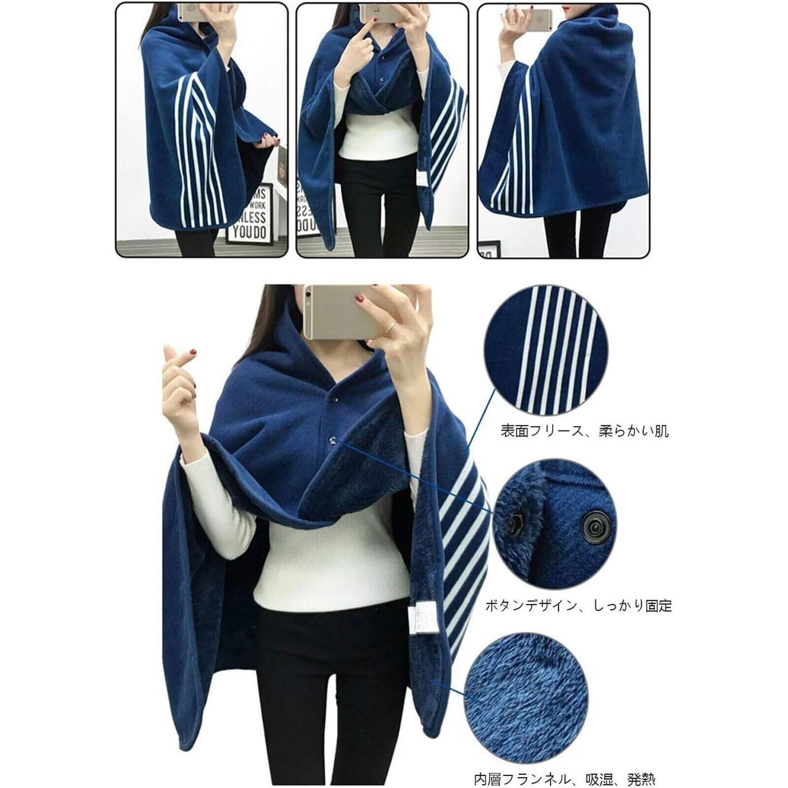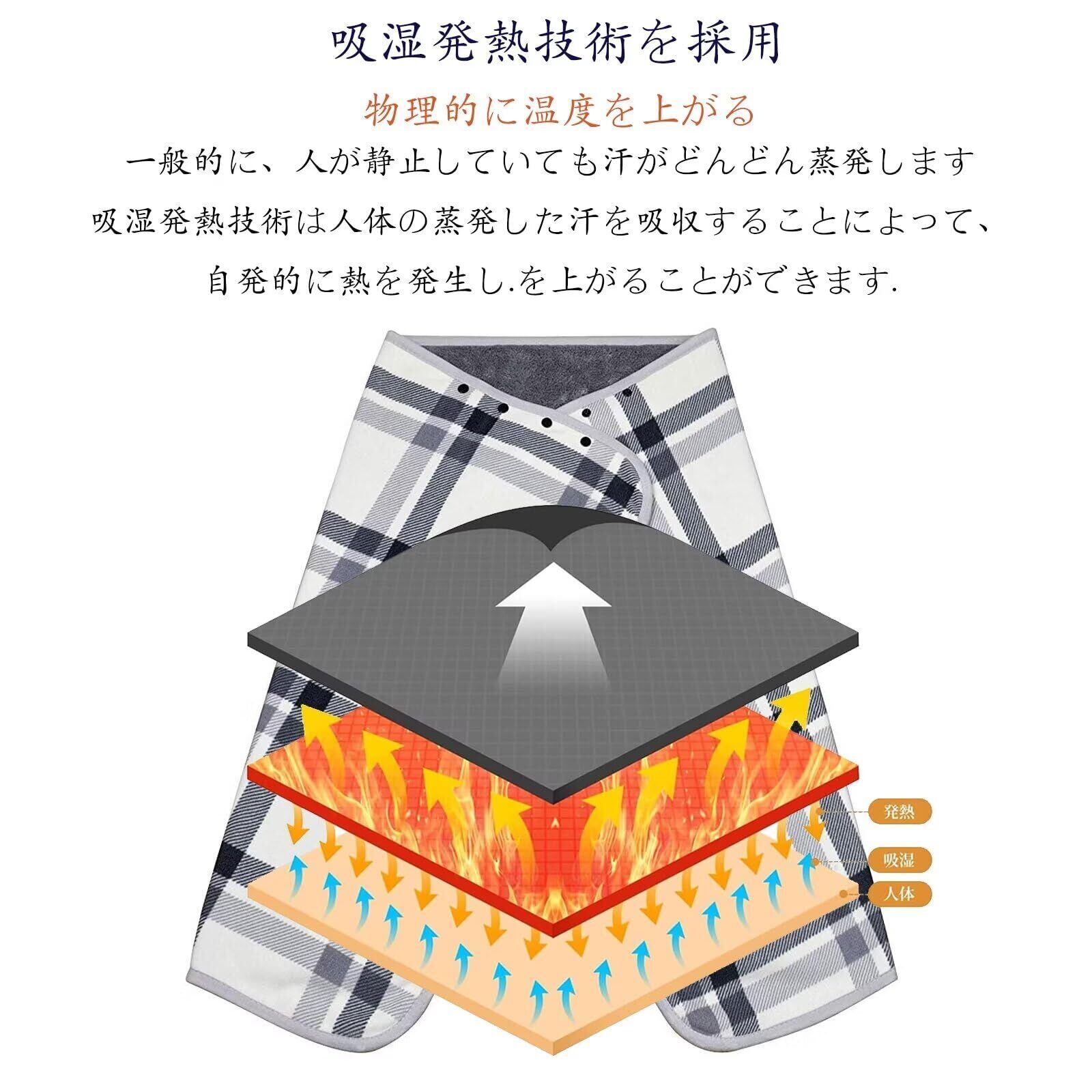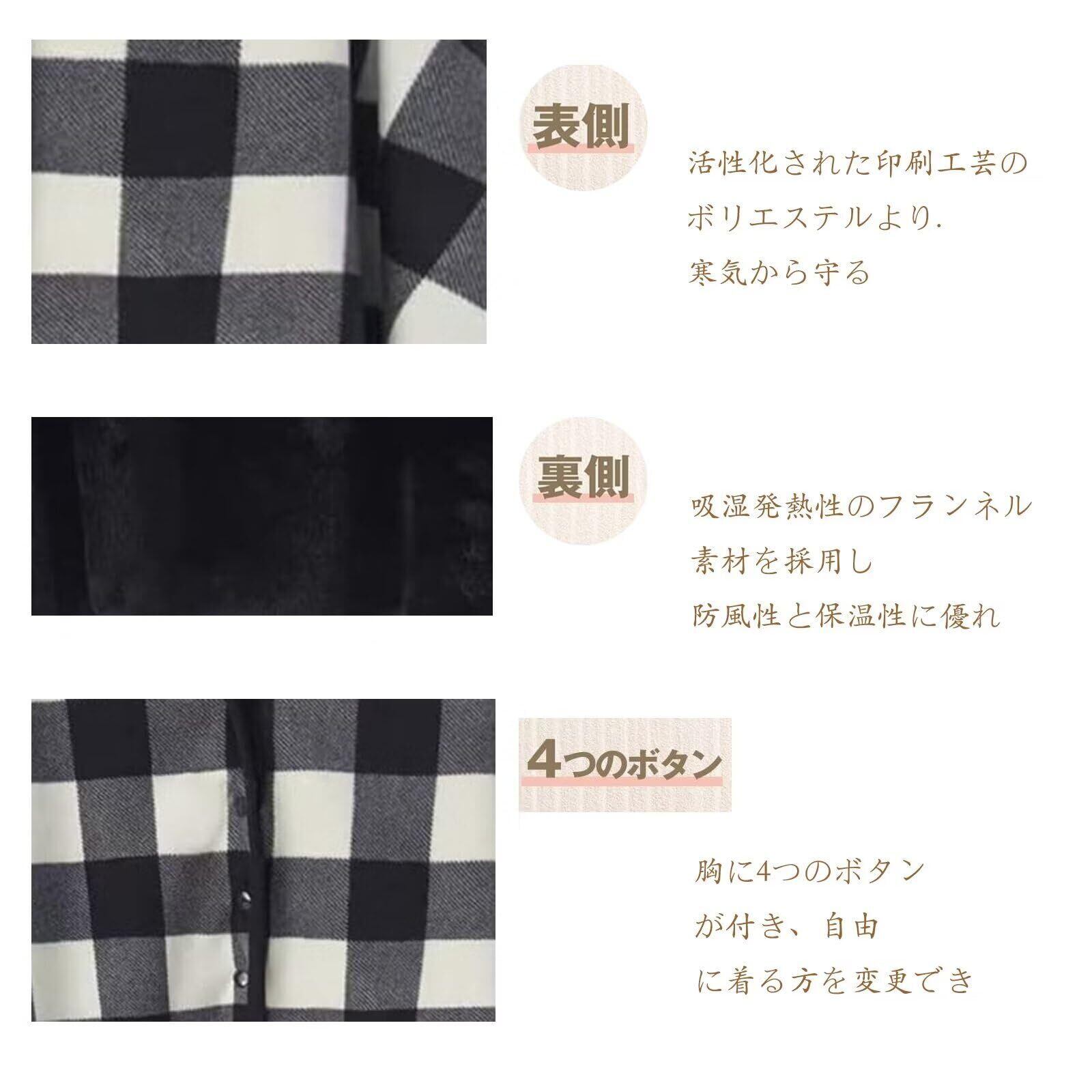 【デザイン】A面:発熱カシミヤ活性印花フリースを採用に対し、B面:は吸湿発熱抗菌消臭法のフランネルを採用する、ふんわりやわらかな肌触りが特徴の素材です。計4箇所にスナップボタンがついており、ポンチョとして羽織ったりスカートのように腰に巻いたりできます。収納時もかさばりにくいのがポイントです。