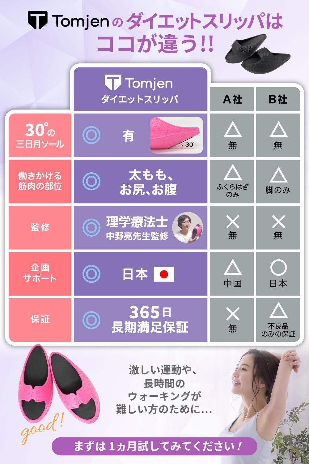 【国家資格の理学療法士監修】Tomjenのダイエットスリッパは、多くのお客様の身体のお悩みをサポートしてこられた理学療法士の中野亮先生が監修。履くだけで自然に脚やお尻、お腹など普段使わない筋肉に力が入り、その結果、美脚効果や美姿勢につながるシェイプアップ効果が期待できます。 【さまざまなシーンで効率的に、ながらエクササイズが可能】Tomjenの健康スリッパはお料理をしながら、テレビを見ながら、歯磨きをしながら…時間に余裕がない方でも履くだけで効率的にエクササイズができるズルい燃焼スリッパです。 【計算された楕円形の30゜三日月ソールで体幹トレーニング】ダイエットサンダルの靴底が不安定なことにより、履くだけでユラユラとバランスをとる体制になります。その結果より高い脂肪燃焼効果が期待でき、メリハリボディを目指せます。 【脚が引き締まる美脚、くびれのある美姿勢、ヒップアップを同時に目指せる】多くのダイエットスリッパはふくらはぎだけ、あるいは太ももまでの働きかけにとどまってしまうものが多い中、当製品は脚全体はもちろん、お腹や腰回りの筋肉にも働きかけるので、身体全体に自然と力が入りやすくなる仕様となっております。 【日本人スタッフの安心サポートと満足】日本人による企画・販売で365日の長期満足付きだから安心。気になることがございましたらいつでもご連絡ください。日本人スタッフが誠心誠意対応させていただきます。