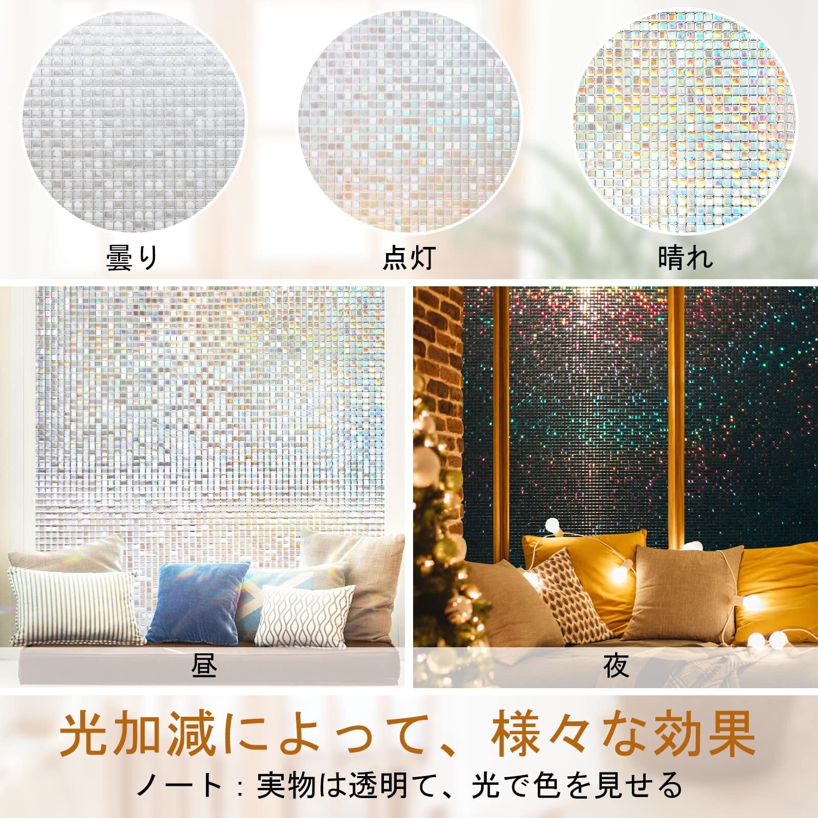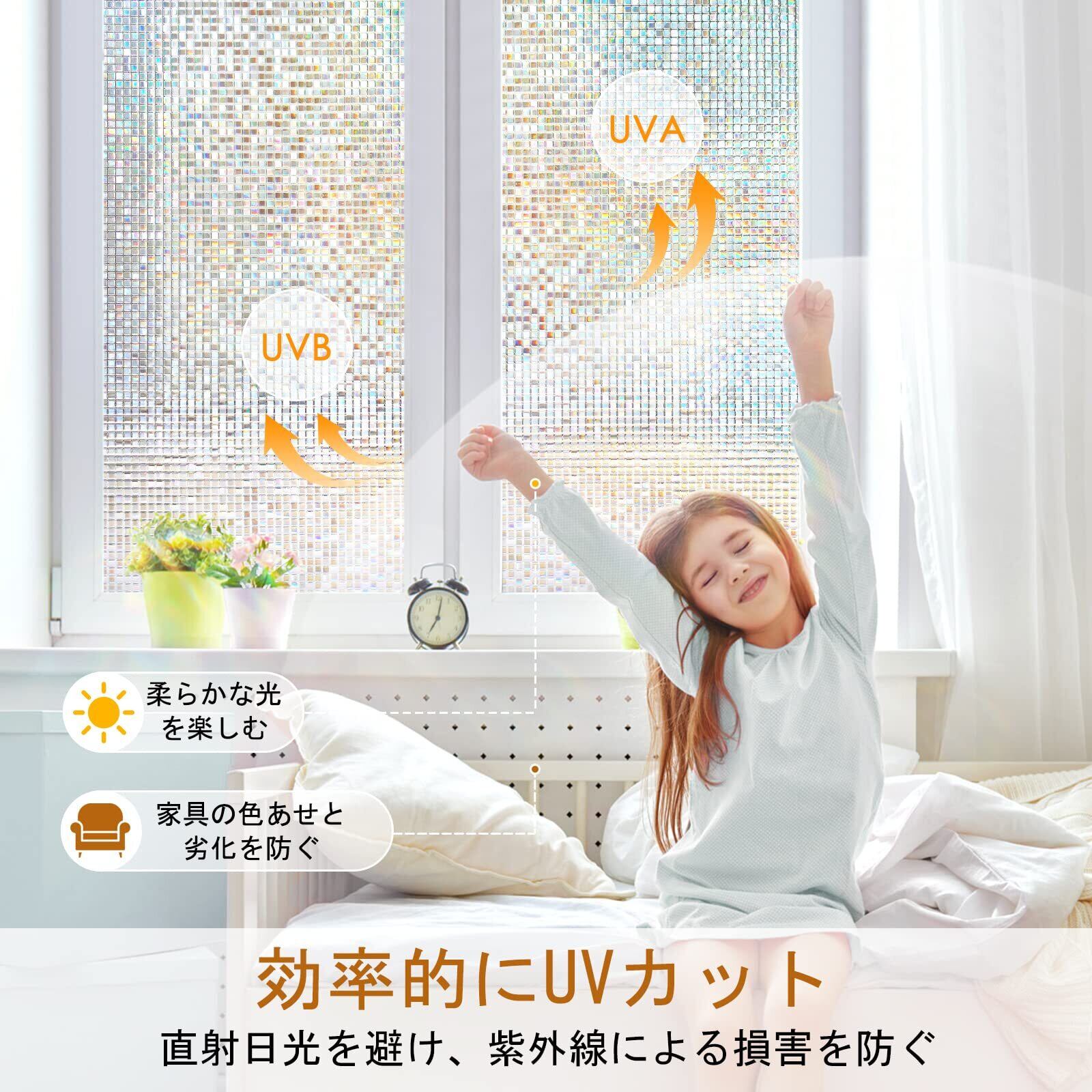 目隠し・日射調整・UVカット:天気や昼夜を問わず、20cm以上離れていれば、室内が見えにくく!また、 UVA 84%・UVB99% 以上カットし、明るさを保ちつつ、内装を保護します。カーテンとさらば!浴室など近距離での目隠し効果が大事なところにはお勧めしません。