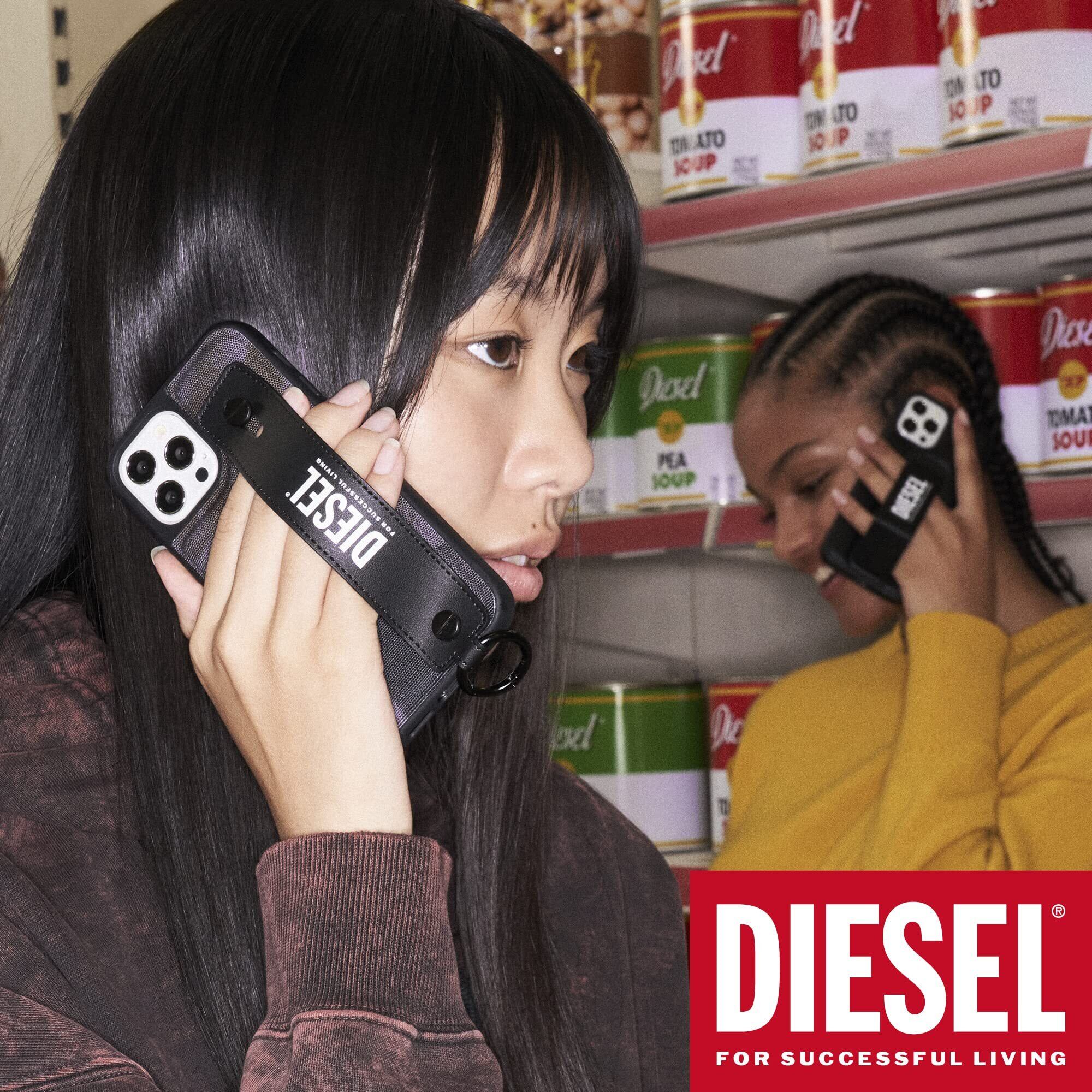 アイコニックなDIESELロゴ入りハンドストラップ付きスマホケース。リングやスタッズなどDIESELらしい細部にこだわったデザインです。