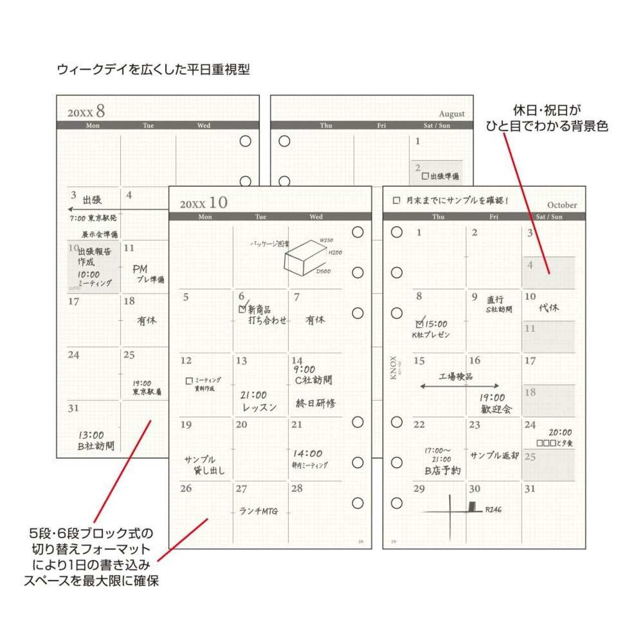 【レイアウト】見開き1ケ月間ブロック式平日ワイド 月曜始まり