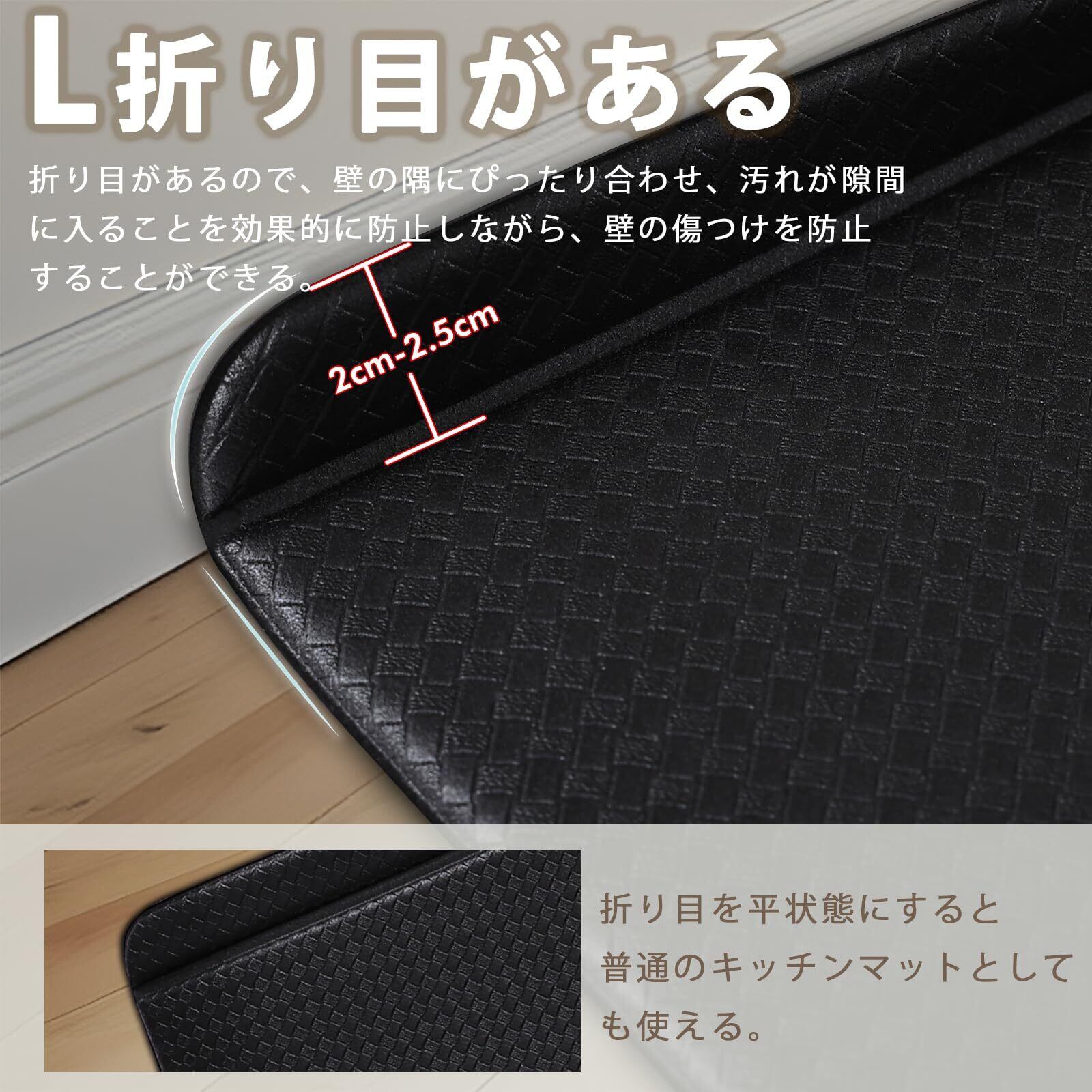 【L字タイプ-床隙間の汚れを簡単に処理できる】油汚れが壁の隅にこぼれる心配がない、L字キッチンマットは壁に当たる側は折目があり、隙間にぴったりフィットし、壁の隅に保護材を設け、隅の汚れを簡単に防止できました。汚れが広がったり隙間に落ちたりしても簡単に片付けられ、楽に隙間を掃除できます。
