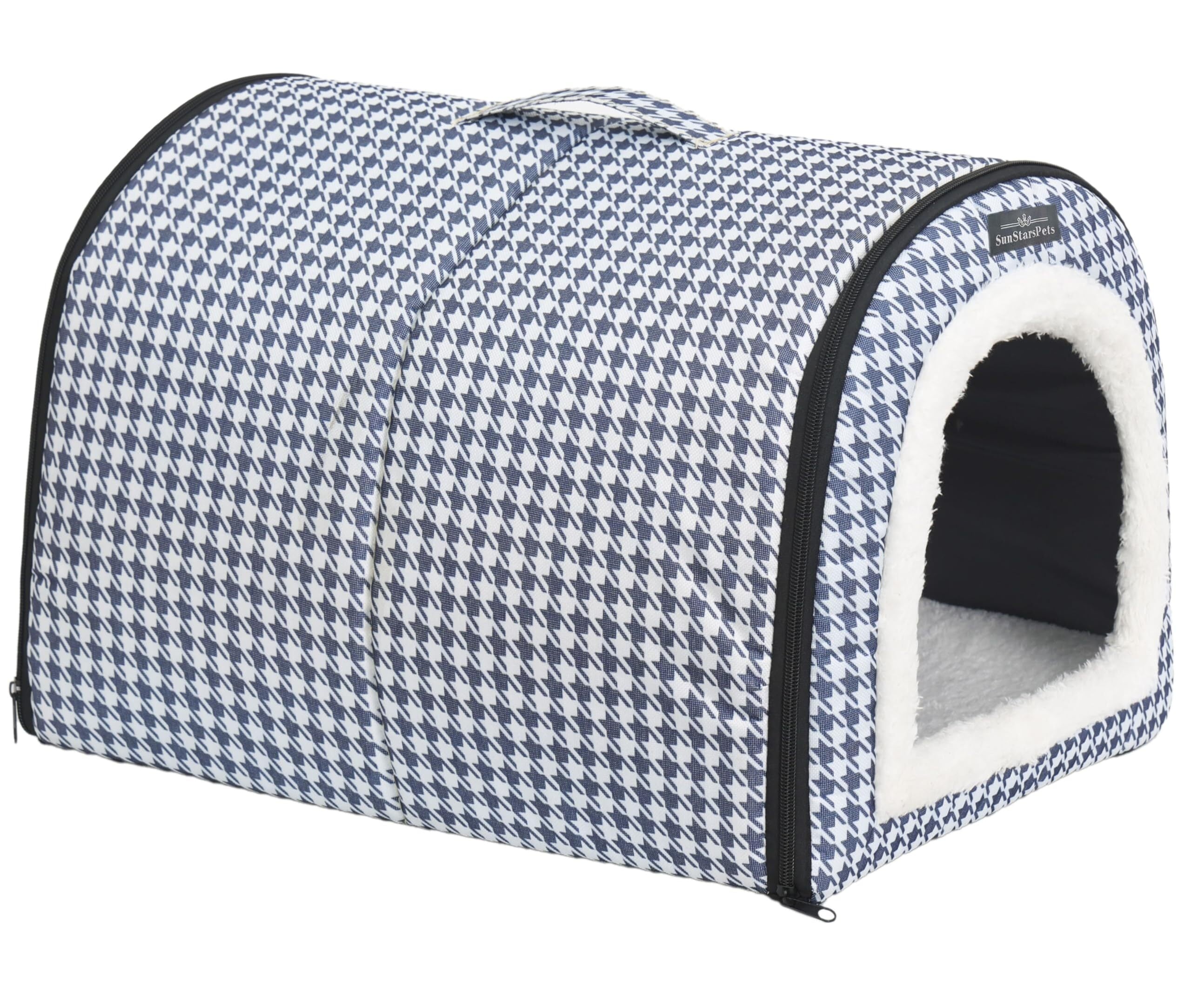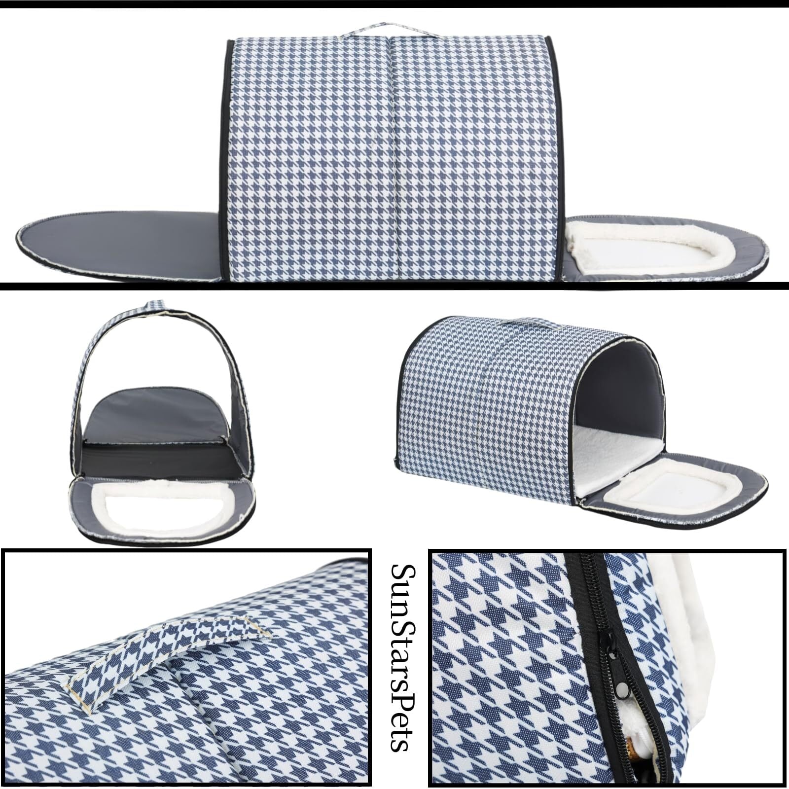 SunStarsPets 猫ハウス ペットベッド キャットハウス ドーム型 暖かい&冷感 両用マット付き ふわふわ 寒さ対策 室内用 洗えるマット (千鳥格子青 S)