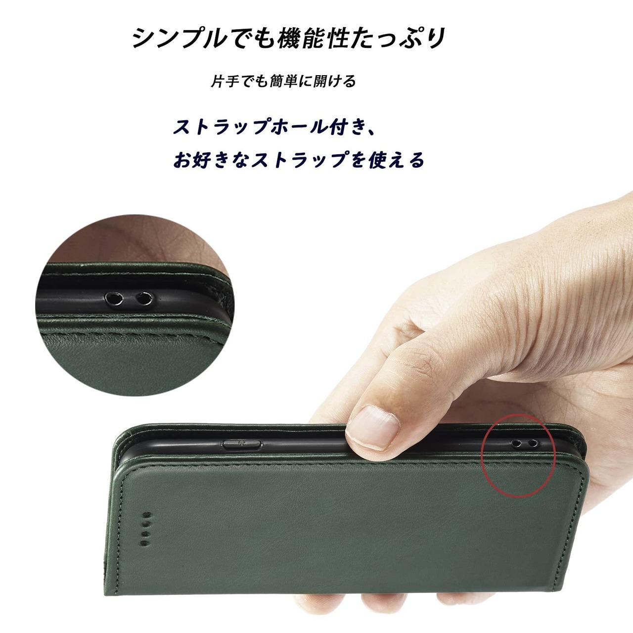 ❸【ストラップホール付き】二つの小さなストラップホールの位置が黒い足とケースの右下にある。お気に入りのストラップを付けることができます。※ストラップは付属しておりません。