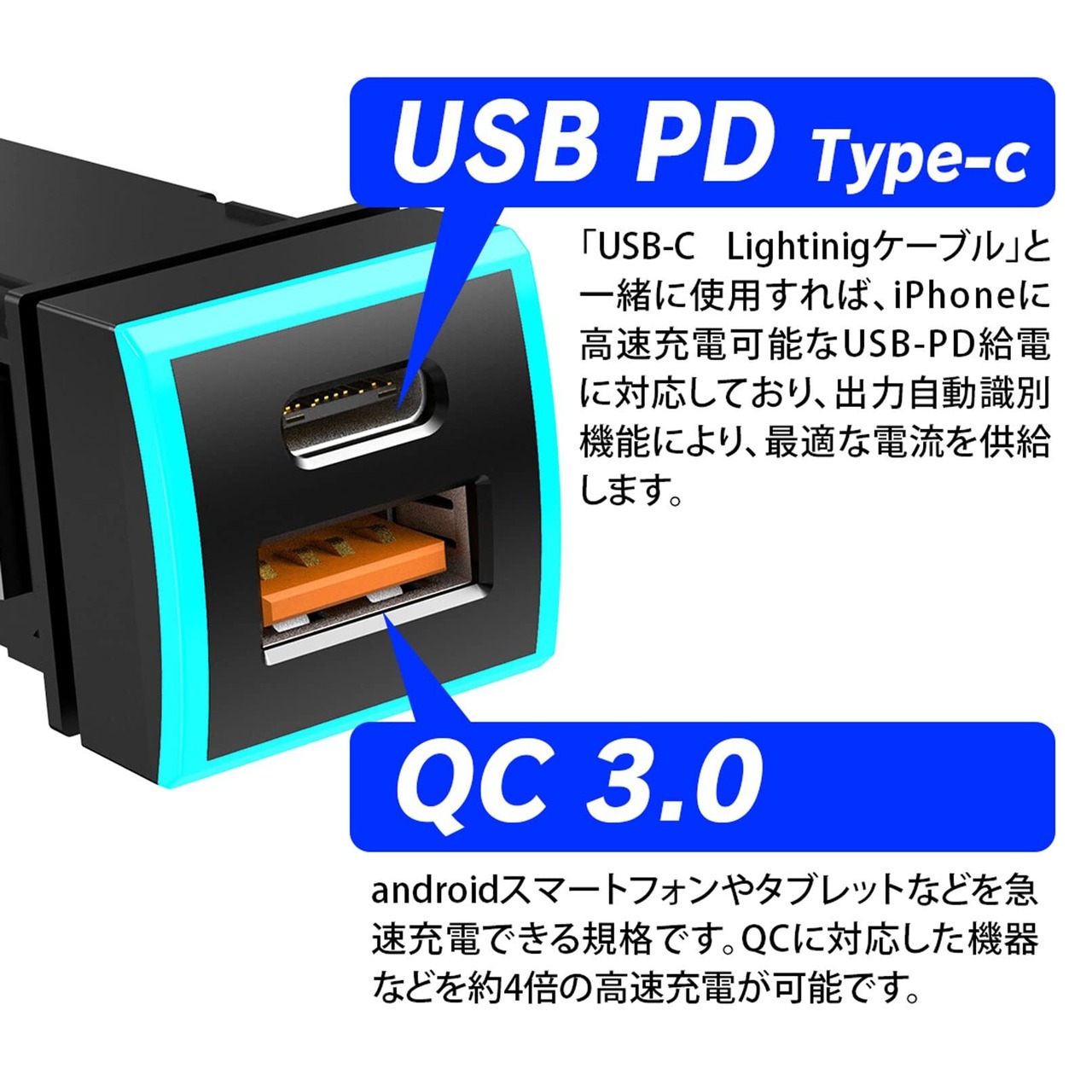 【トヨタ車対応のUSB QC3.0 + Type-C PD 2ポートカーチャジャー】 空いているスイッチパネルに取り付けるので純正パーツのような仕上がり。 iPhone/iPad/Android/IQOS等のあらゆるUSB機器をフルスピード充電が可能な車載充電器。