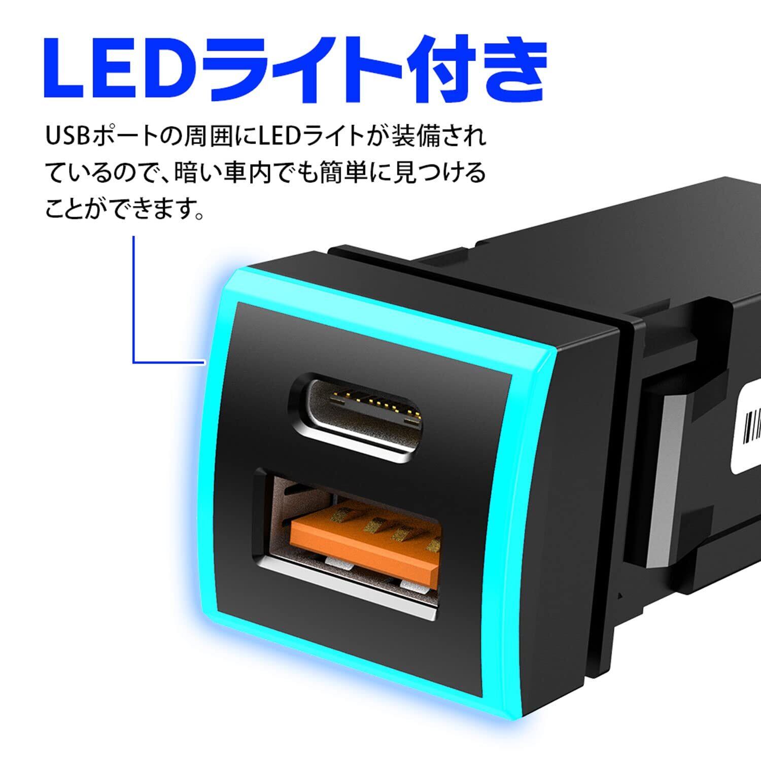 USBポートの周囲にLEDライトが装備されているので、暗い車内でも簡単に見つけることができます。