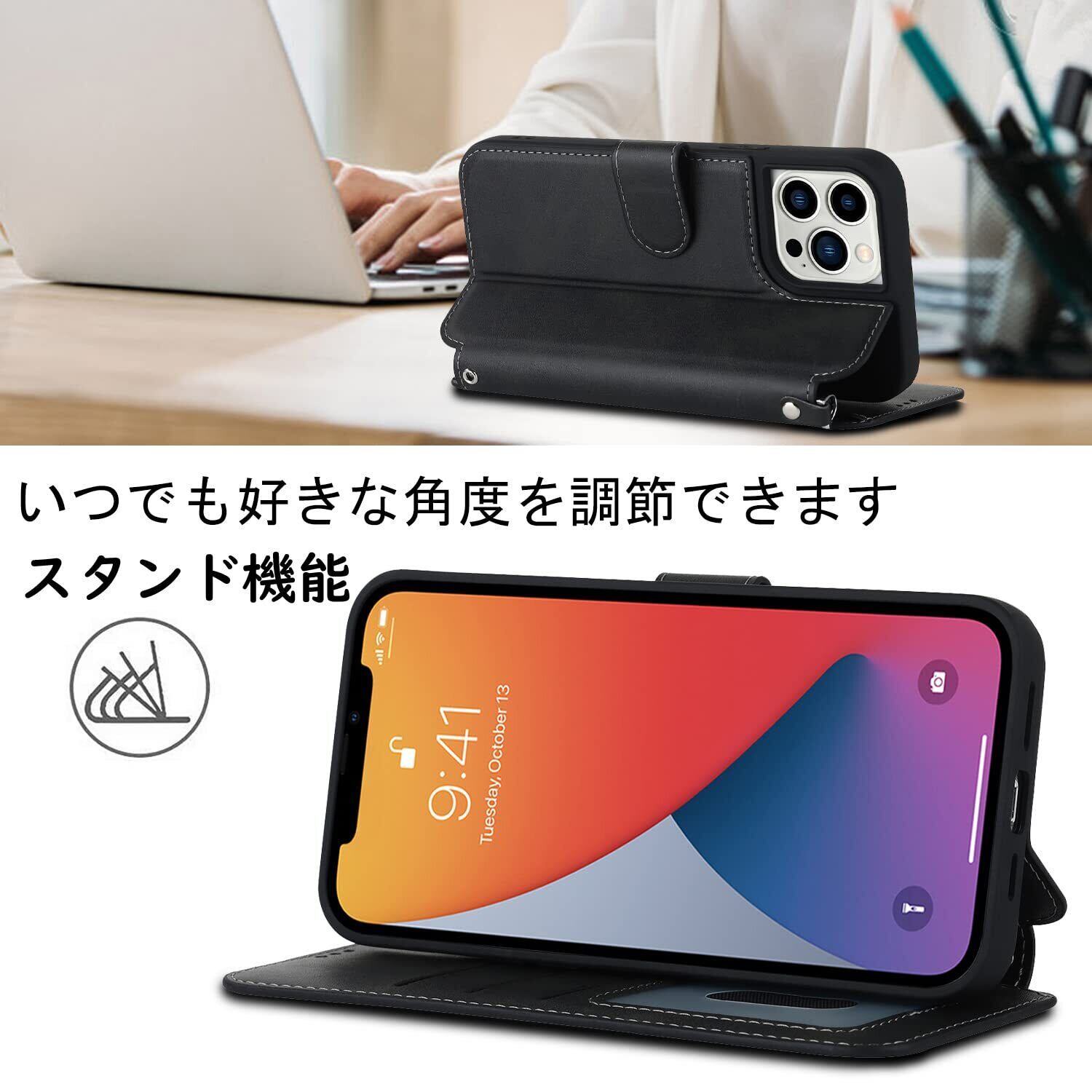 【横置きスタンド機能】マグネットが内蔵されているので、ベルトがなくてもフタがぴったり閉まります。横置きスタンド機能が付きまして、好きな角度を調節です。カバーにスピーカーホールを設置し、閉じた状態での通話を可能にしました。