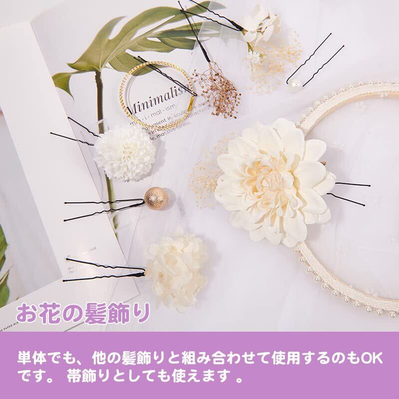 【髪飾り用途】お花の髪飾りです。アップヘア、サイドアップ、お団子、編み込みなど人気のまとめ髪の補助やアクセントにオススメです。卒園式、七五三、お正月、お祝い事、成人式、卒業式、華やかなお席の和装、振袖姿、浴衣にぴったりします。七五三の髪飾りは前撮りに最適。