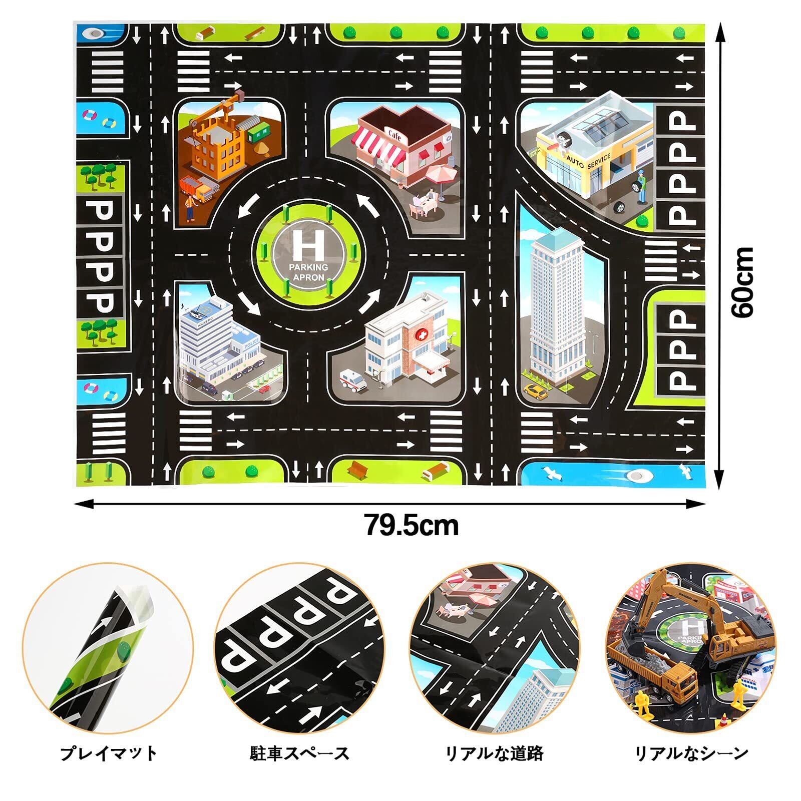 【建設現場の車両プレイセット】折りたたみ式プレイマット1台、クローラークレーン1台、フレキシブル掘削機1台、交換部品3個付きのトラクター1台、セメント1台、輸送トラック1台、燃料トラック1台、人形、安全道路標識、石などの建設用おもちゃセットです。