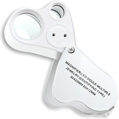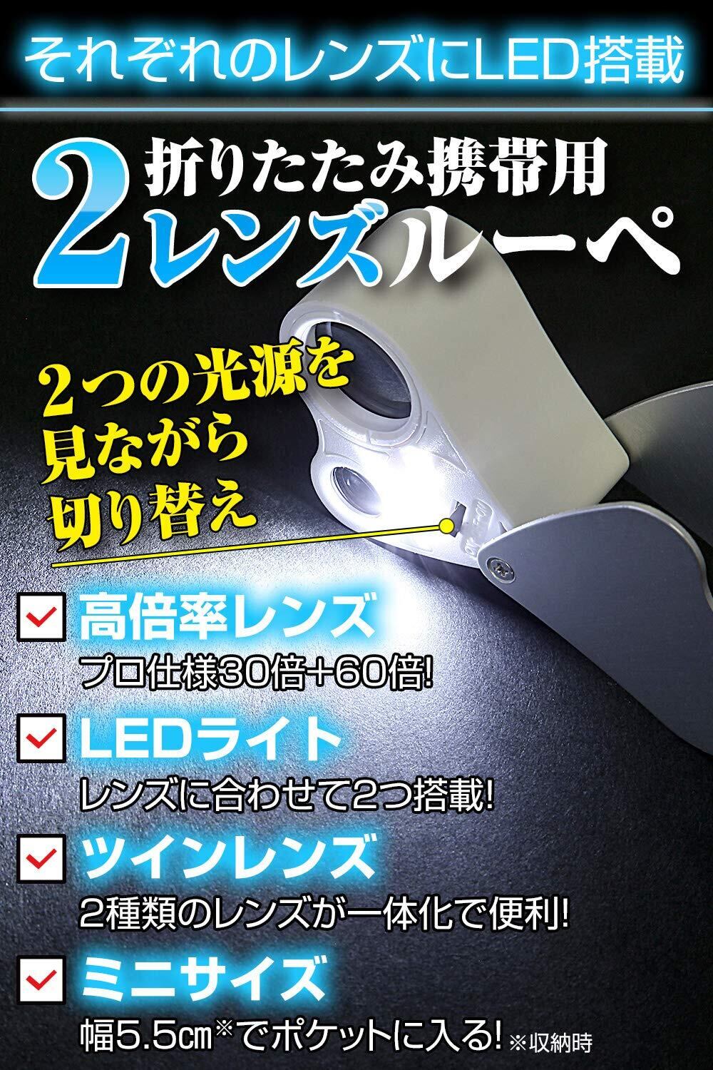 【コンパクト携帯ルーペ】ジュエリー鑑定校正、校閲用携帯ルーペです。2種類の高倍率レンズが一体化!大鏡30倍、小鏡60倍と用途よって使い分けOK!LEDライト搭載で暗所での使用も安心。使い終わったらルーペ部分を収納でき、コンパクトになり携帯に便利です。