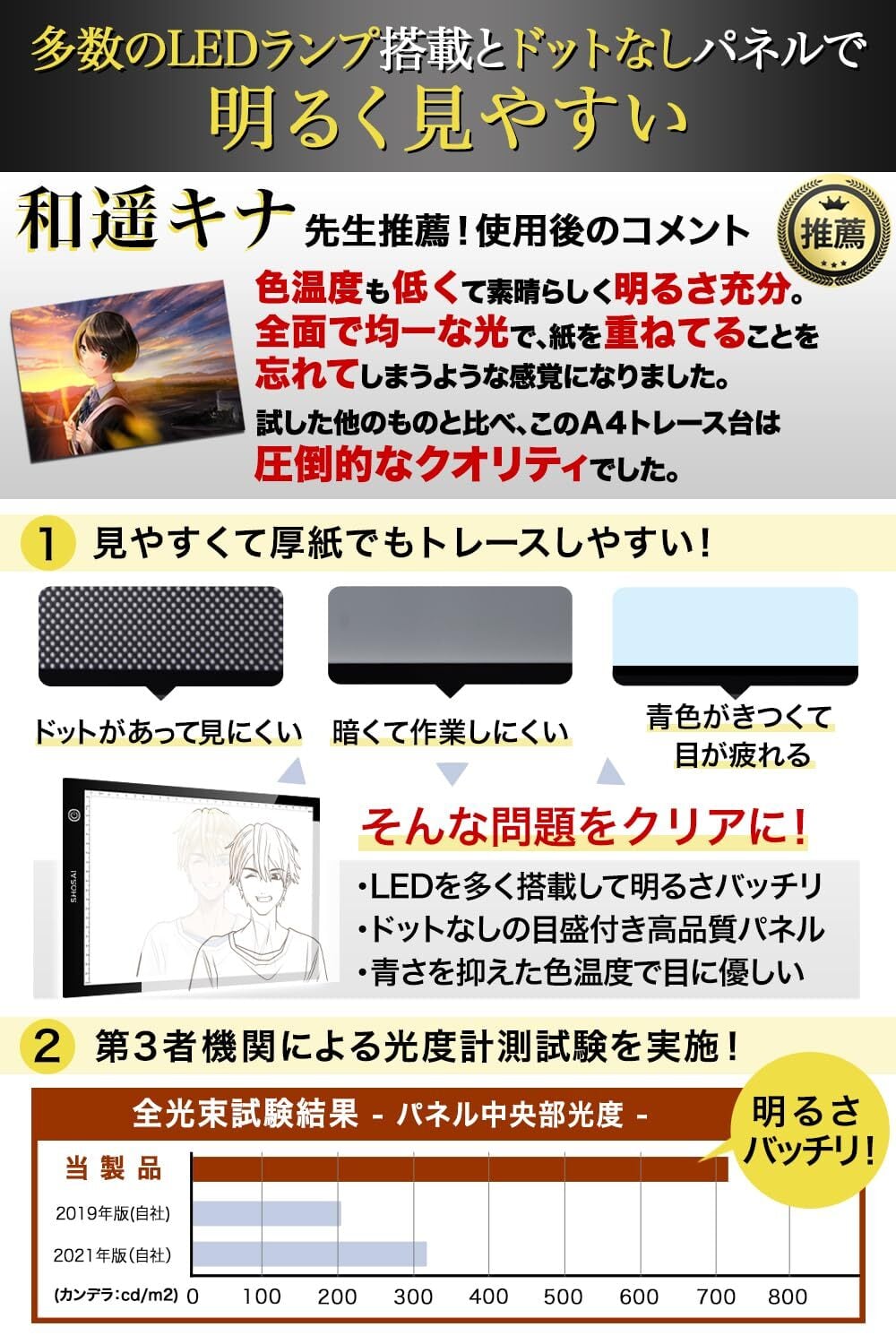 【プロ推薦の高品質モデル】 LEDライト を多く搭載し 高輝度 を実現。 ドットなしの 高品質パネル による全面発光で、均等な明るさとちらつきを軽減した快適な作業環境を提供します■ボタンの長押しで 無段階調整 ができ、タッチ感度も良好ですので ストレス なく調節できます。トレース用紙の厚さに応じて明度調整するのがおすすめです。