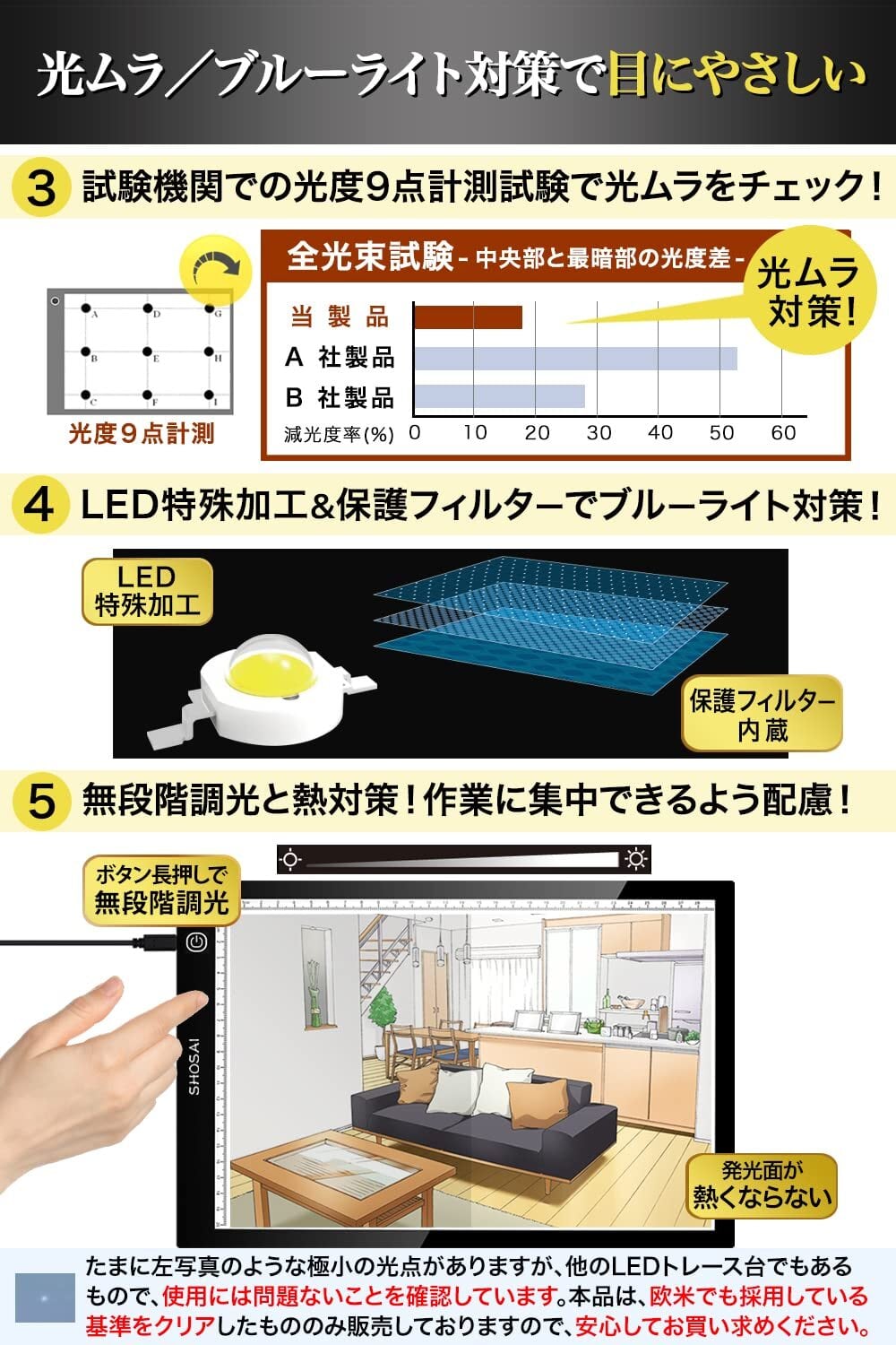 【第3者機関での品質確認】 日本の試験機関でチェックを行い ライトテーブル の確かな品質を確認しています。プロのイラストレータ様に推薦いただいており、自信を持って商品をお届けします■パネルは高品質なものを採用し明るくみやすいので 漫画原稿用紙 スクリーントーン を使った トレース イラスト 作成 製図 おえかき 写し絵 に最適です